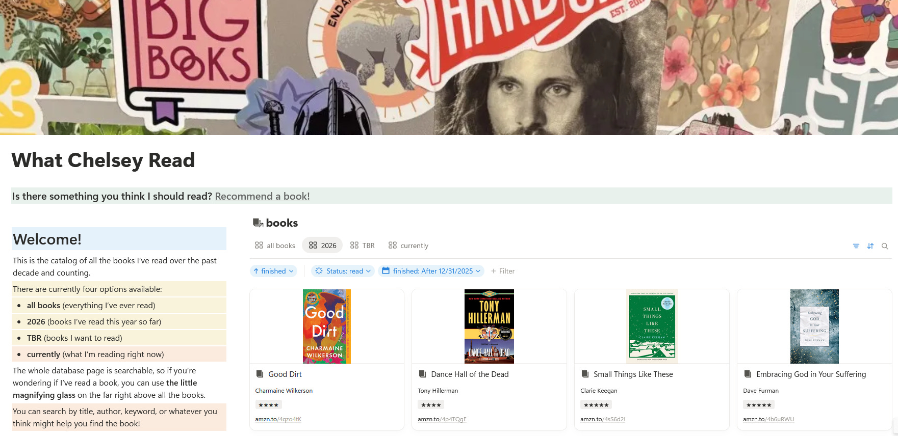 The database that runs that page is one I developed in Notion. Much like my frustration with planners, none of the established tracking systems track all the things I want to track. I’ve decided to stop tracking my books on Goodreads, Storygraph, or anything else. (One day, I might make my reading log a downloadable Notion template, but that’s a project for future Chelsey.)