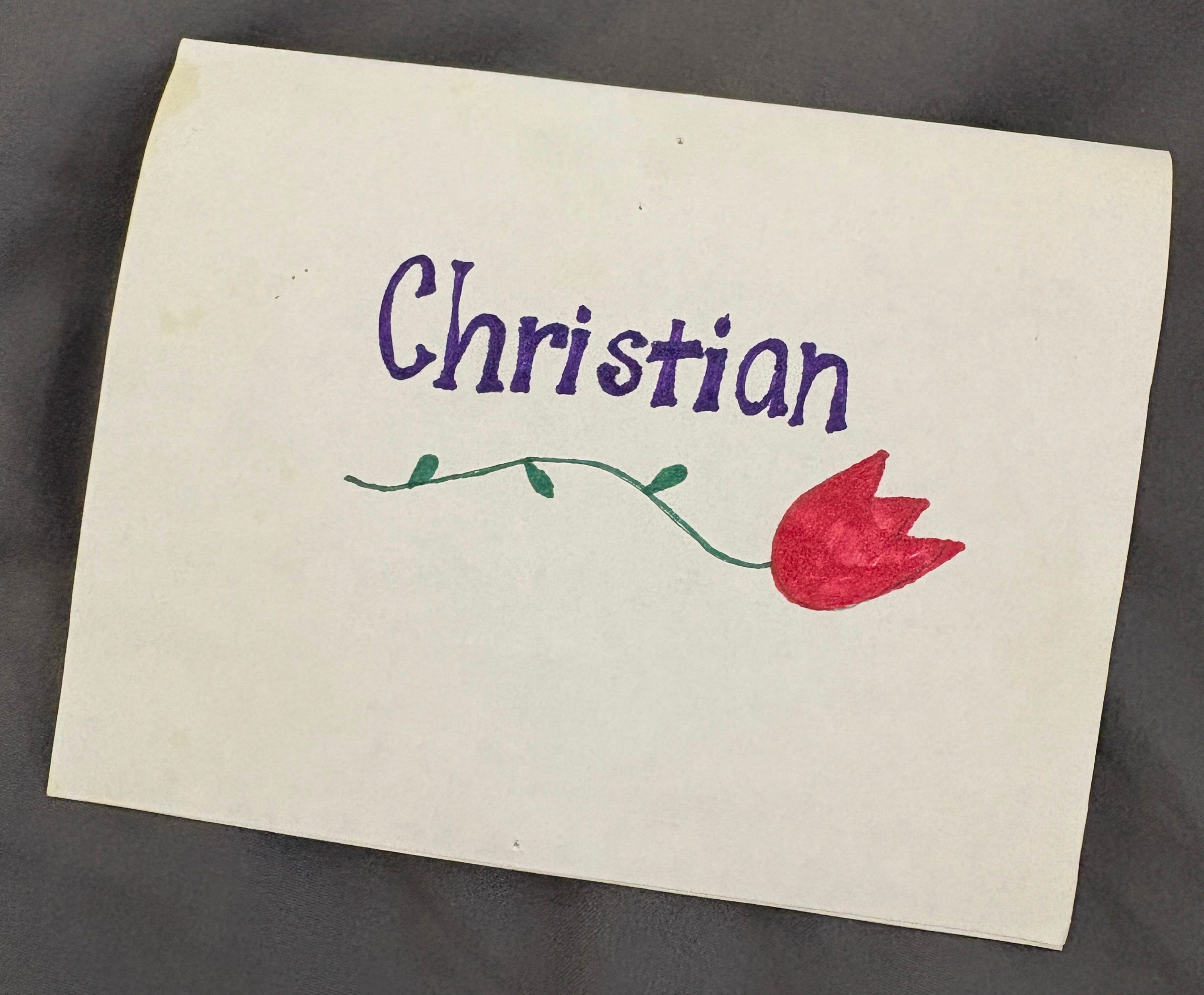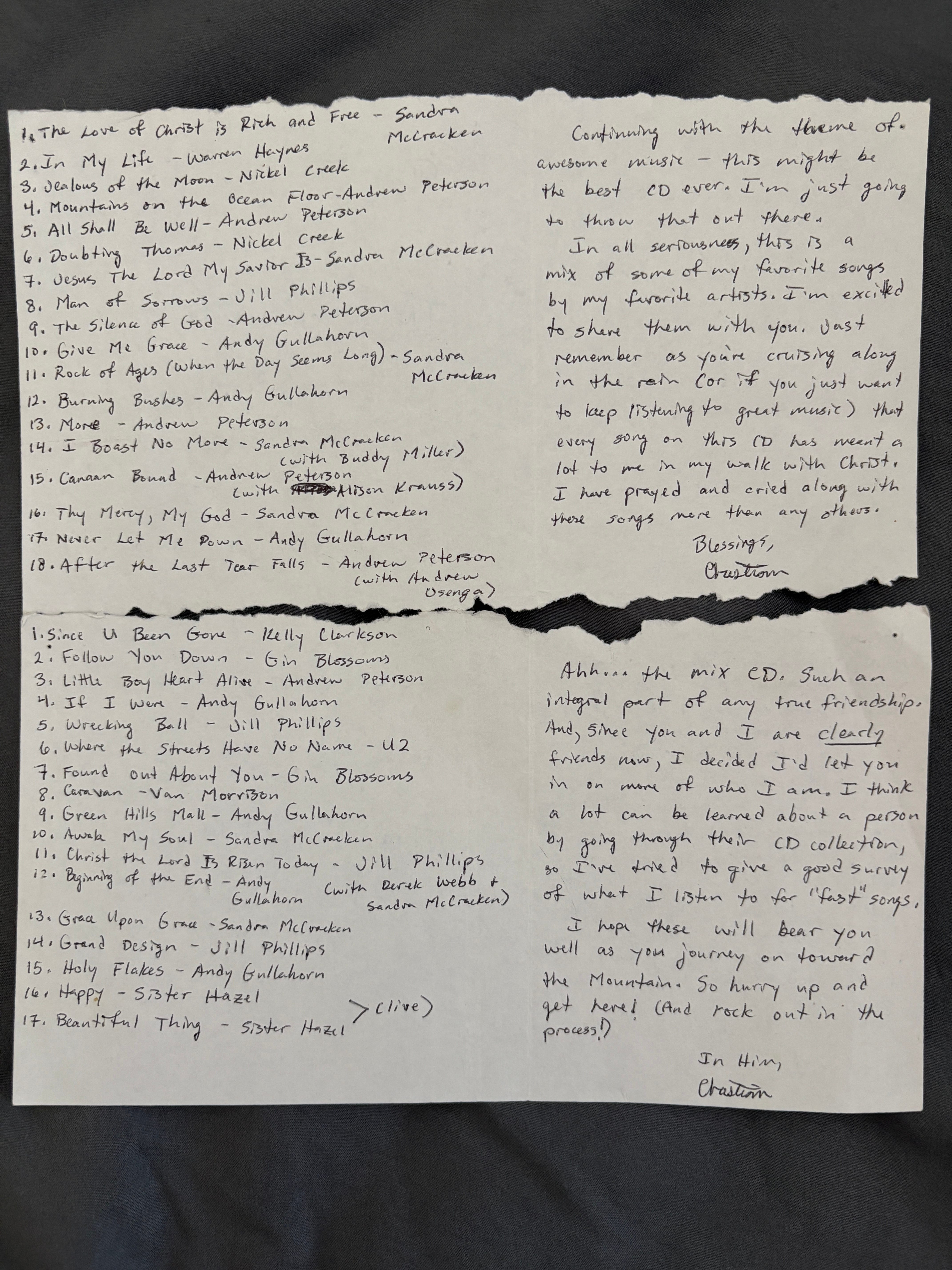 As I was taking the picture of the song titles, I realized for the first time that Christian apparently didn’t own scissors. It appears he just ripped a piece of paper in order to create two pieces of paper approximately the size of CD liner notes. I did not notice this at the time and thought this was one of the most meaningful things anyone had ever done for me.