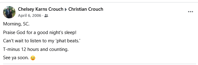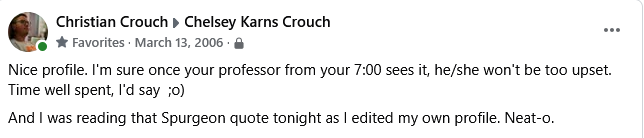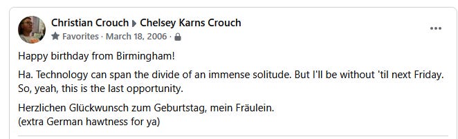 Less than a week after we really started talking online, Christian went on a mission trip to Florida for his spring break. This meant we could not communicate during this time because texting was expensive back then and he wasn’t taking his laptop to use AIM. However, my birthday happened while he was gone. Somehow he managed to find a way to get on Facebook (an Internet cafe? I have no idea) and he wrote the following:
