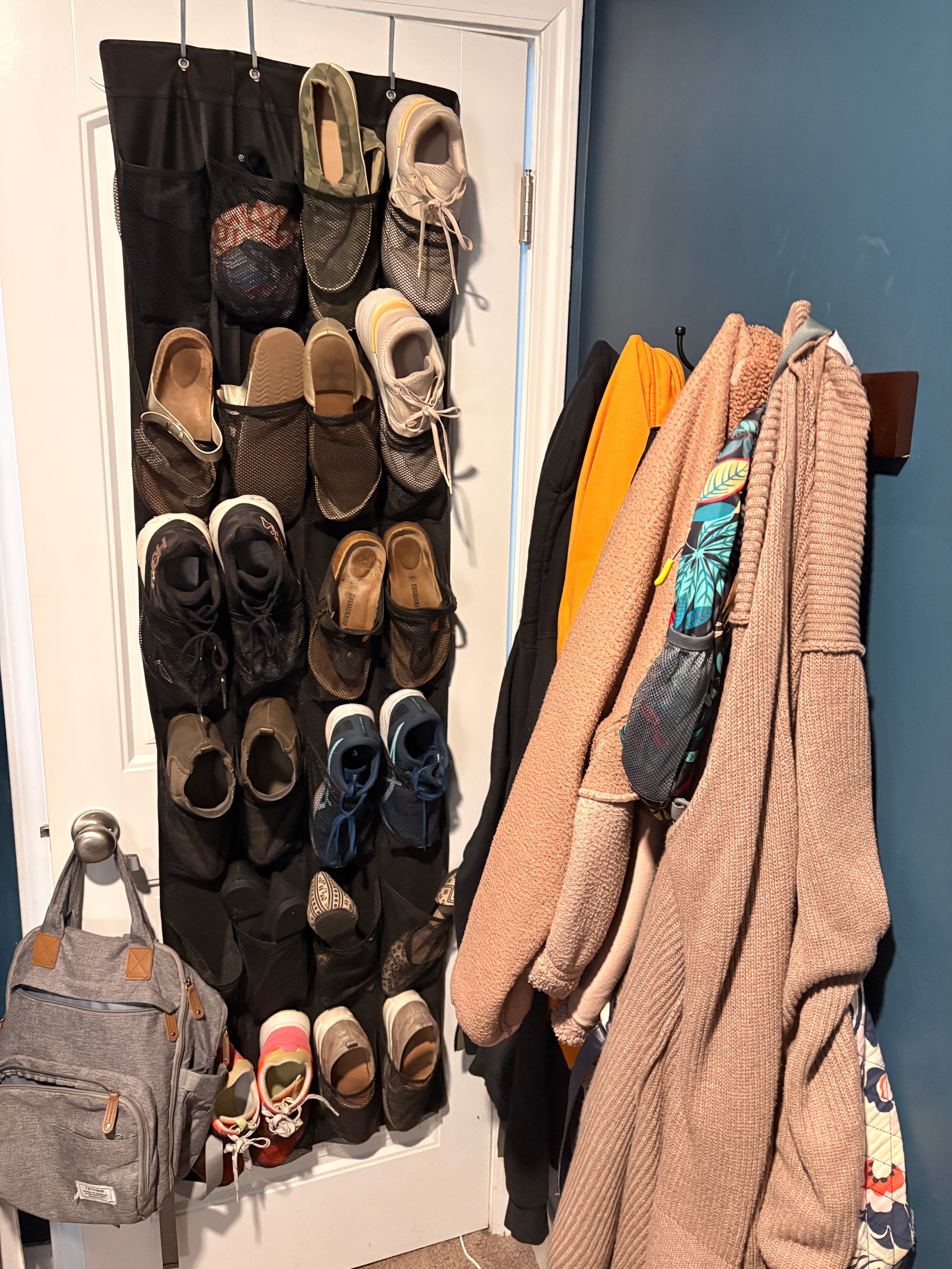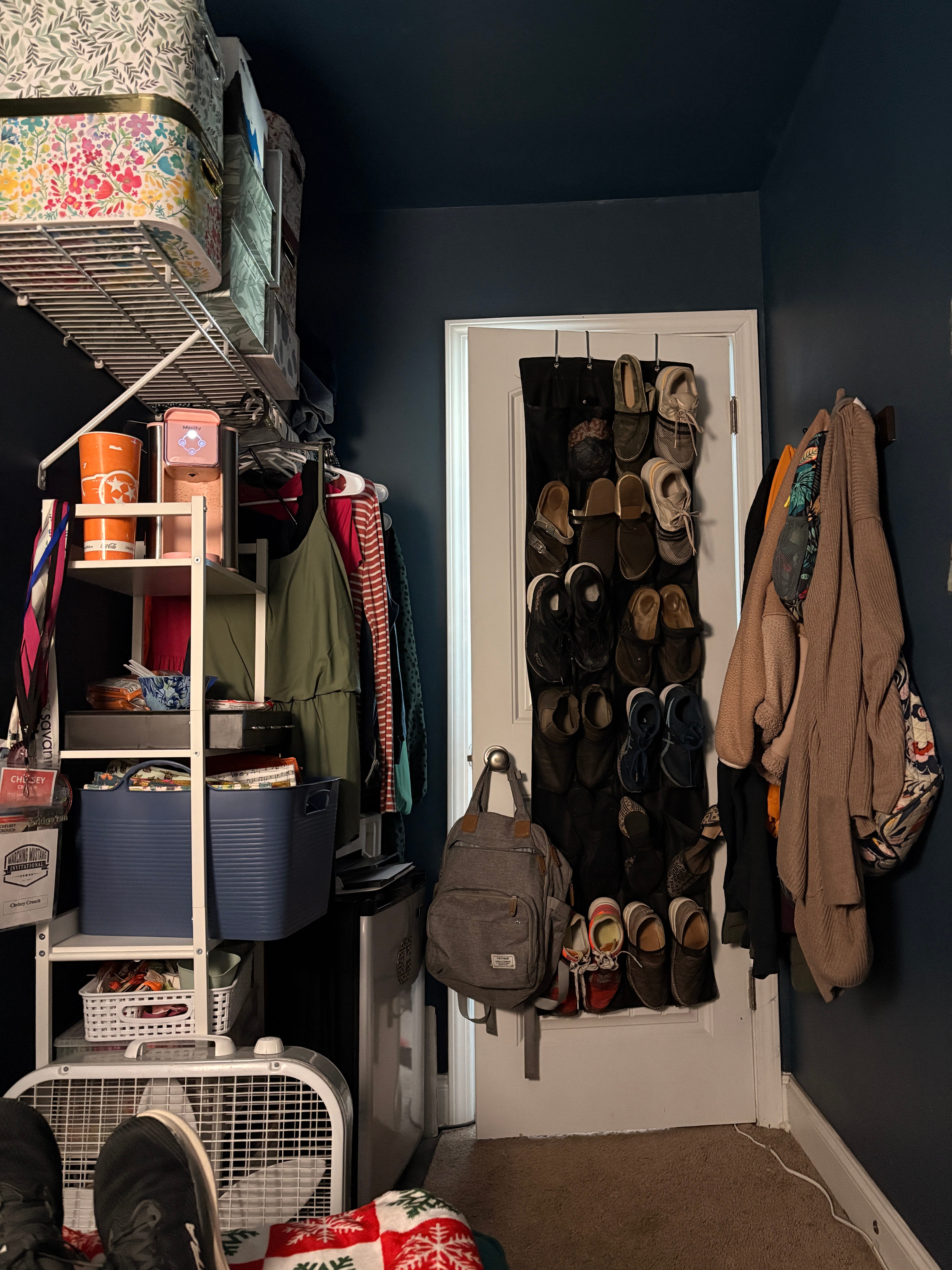 When I am sitting in my blue chair, this is what I can see. I’ll share more details in a minute, but all of my clothes that aren’t in my dresser are here, except for a few warm weather items that are in a bin in the bottom of my husband’s closet.