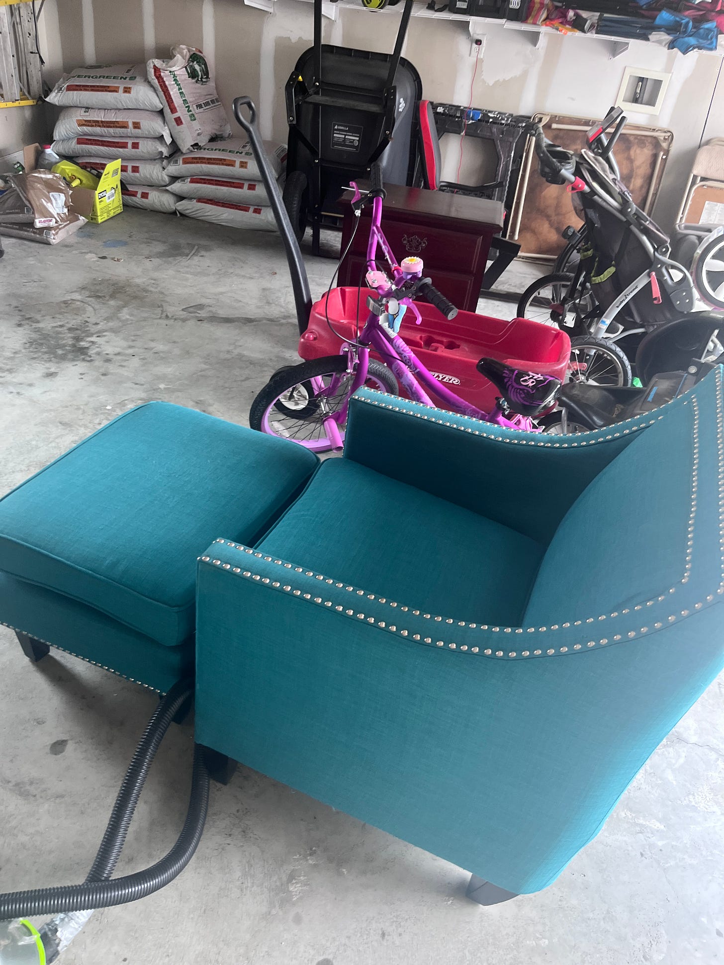 I happened upon this dark teal chair on Facebook Marketplace for $100 while I was in the middle of painting the closet. The seller seemed legit—they were downsizing and didn’t want to move it. It even came with its own ottoman. It was located only about 15 minutes from my house, so one afternoon I loaded up my little kids and drove to get it. I handed over $100 and took this home. I vacuumed it and cleaned it and let it stay in the garage until I was done painting.