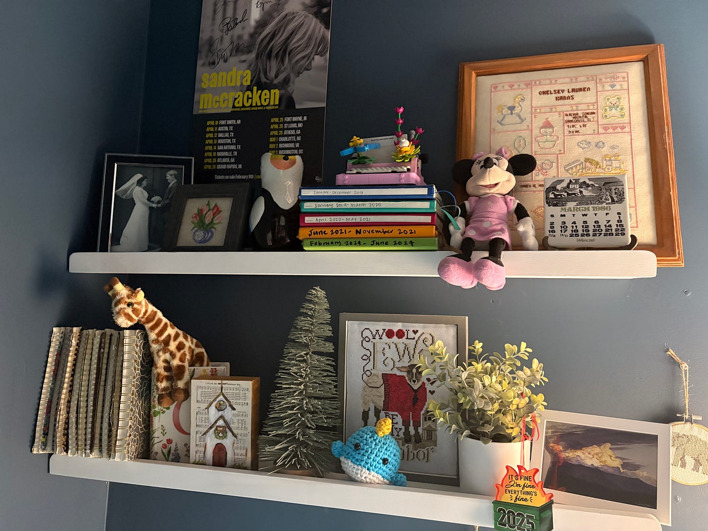The floating shelves contain an amalgam of things that are important to me, and some things get switched out. In fact, after I took this picture I realized I still had a Christmas item on the shelf (the wooden block with the church). Included on this shelf are a few cross-stitch pieces, a narwhal I crocheted, and a few items I’ve had since I was a baby.