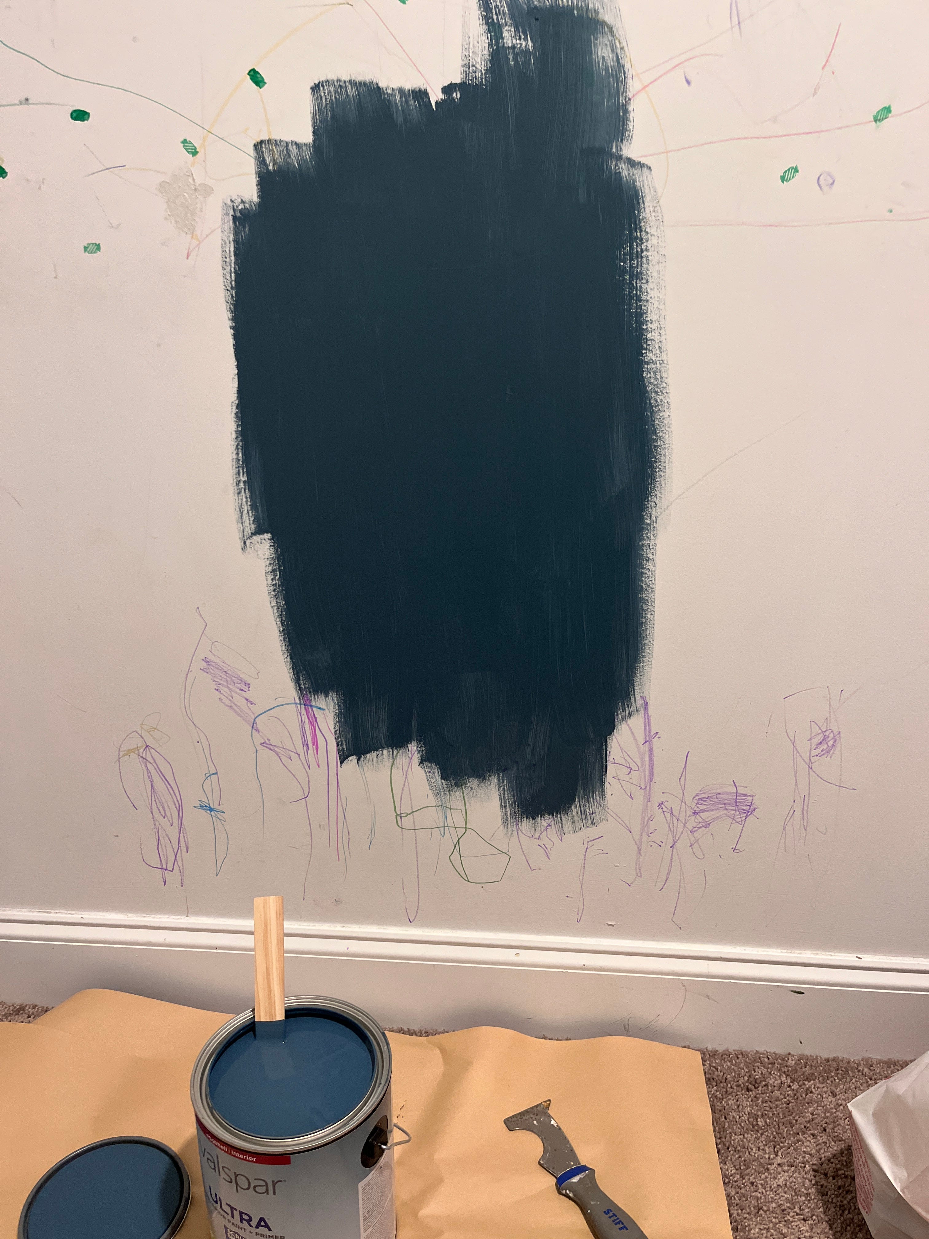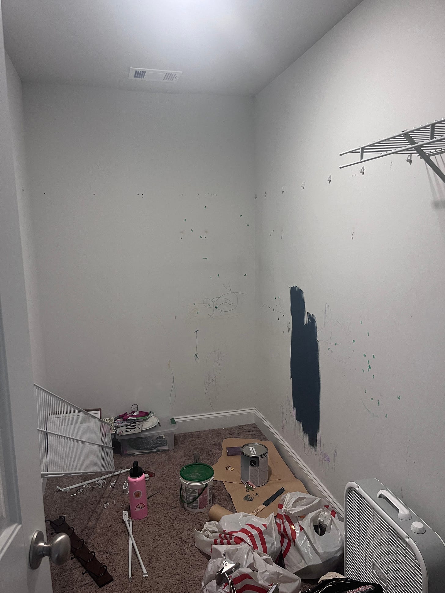 I now had a large, almost unused empty closet. You can see in the picture above that Noah had really taken to expressing himself on the walls. There were stickers, crayon marks, and marker streaks all around where the crib. (Know that I had never knowingly left him in there with a writing utensil; if you have ever known a toddler well, you’ll understand.)