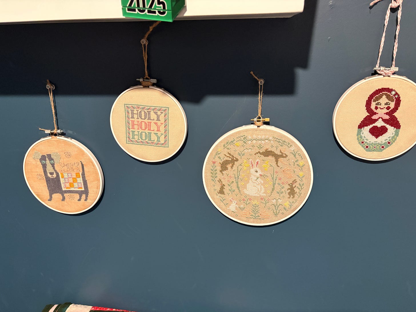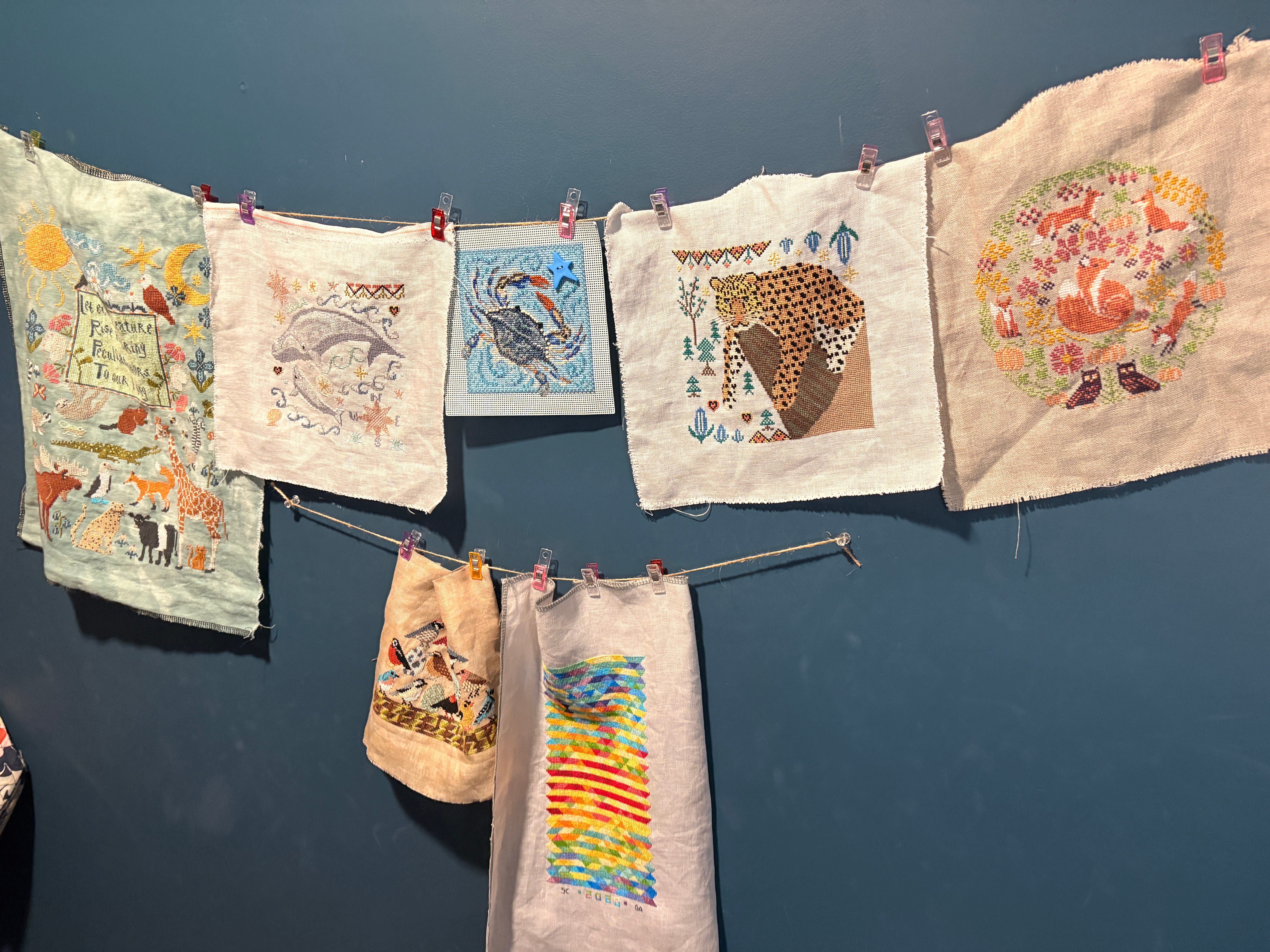 This is my makeshift gallery of some of my cross-stitch finishes that I need to frame or do something with. I have about 25 other pieces in a box that I also need to do something with, but these are currently hanging up so I can enjoy them while I continue to not do anything else with them.