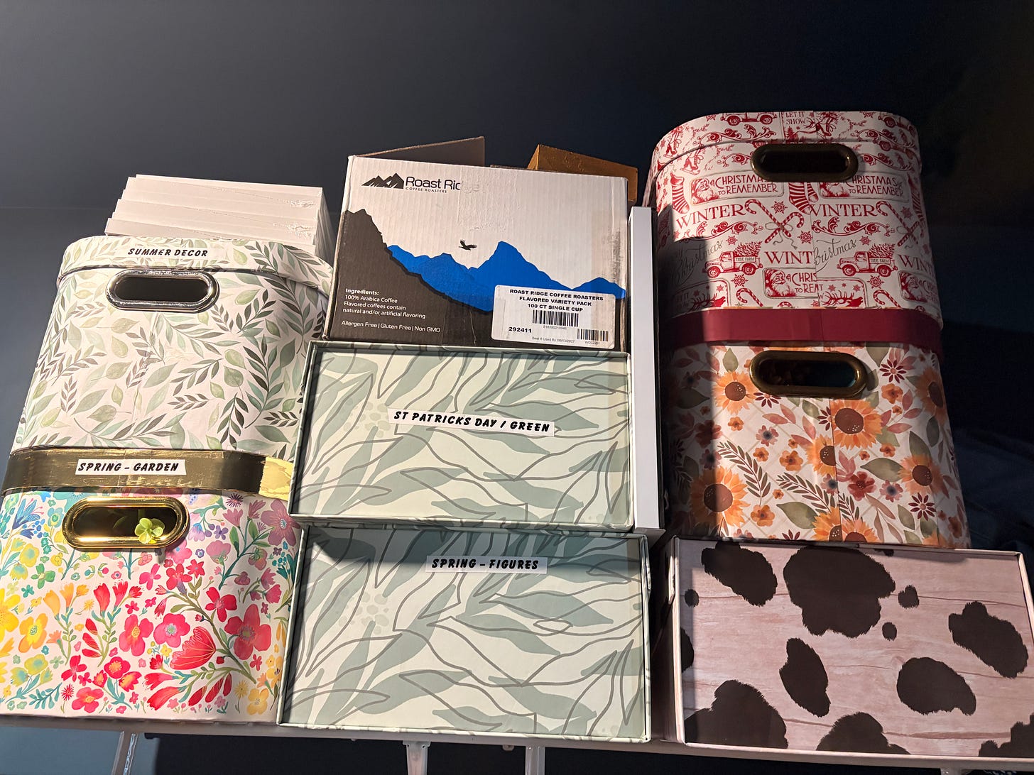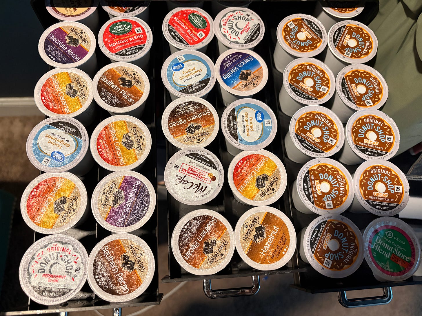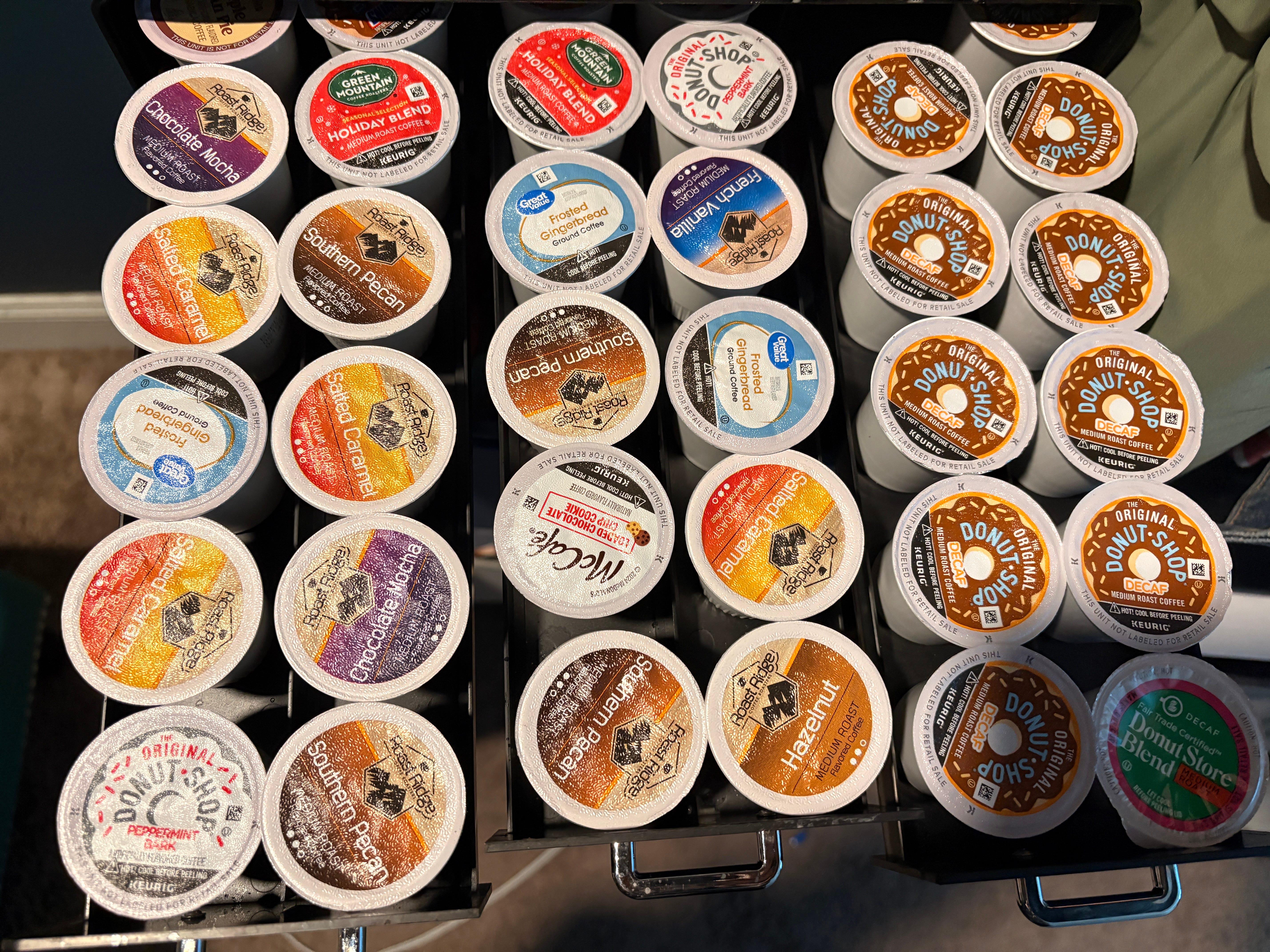 I have realized I am very weird about my K-cups. You may be looking at this and thinking that this looks very chaotic, but let me explain. First of all, the right drawer is just decaf. The other two drawers are regular coffee but I enjoy mixing up the flavors and never have the same flavor two days in a row, so I purposefully put them in so that no two of the same are touching. I recognize this is probably weird, but this is my Dopamine Den, and within its hallowed walls, I may do as I please.