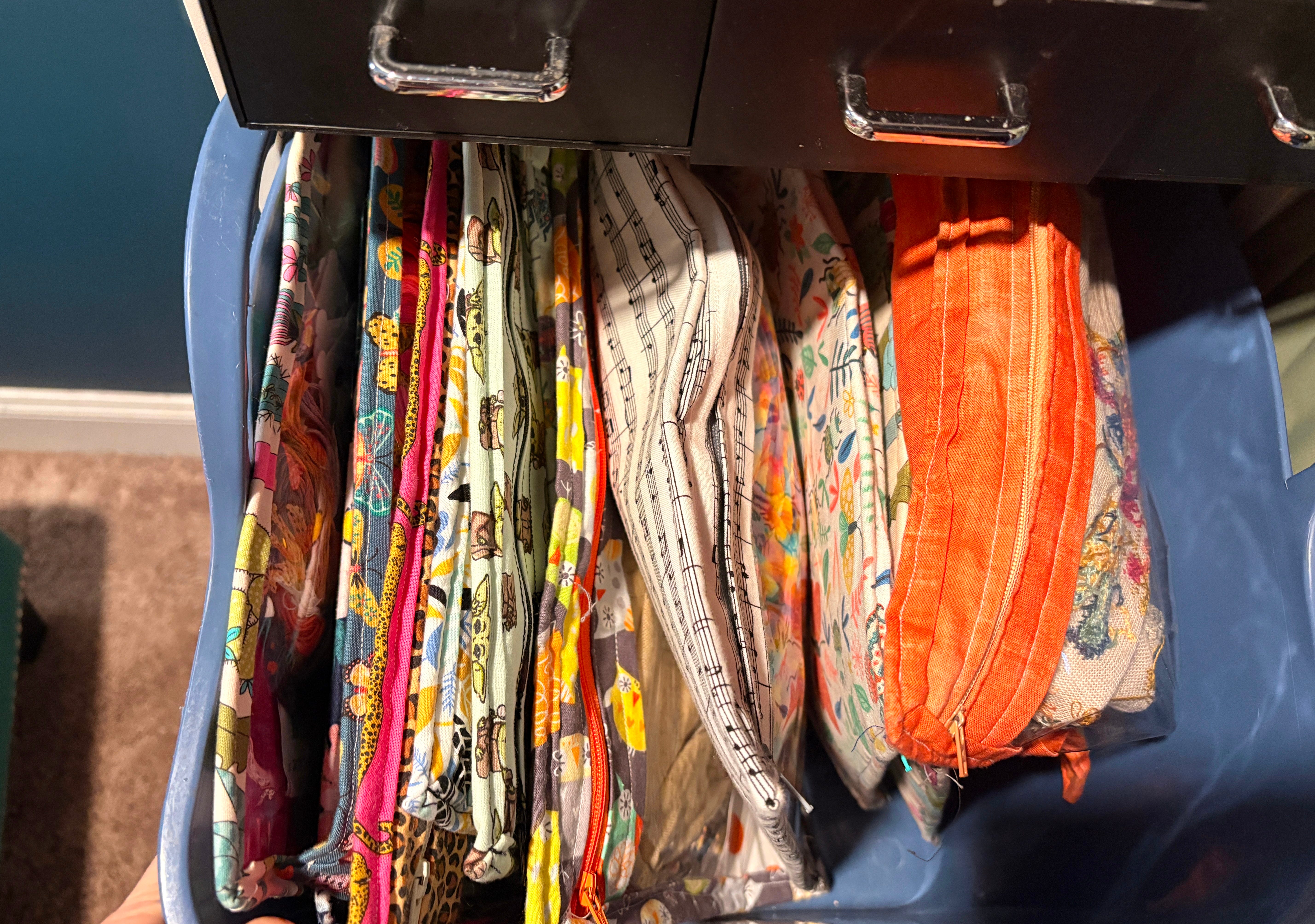 In a basket on the shelf are all of my cross-stitch and crochet “works in progress,” which I keep in project bags with vinyl fronts that I made myself.