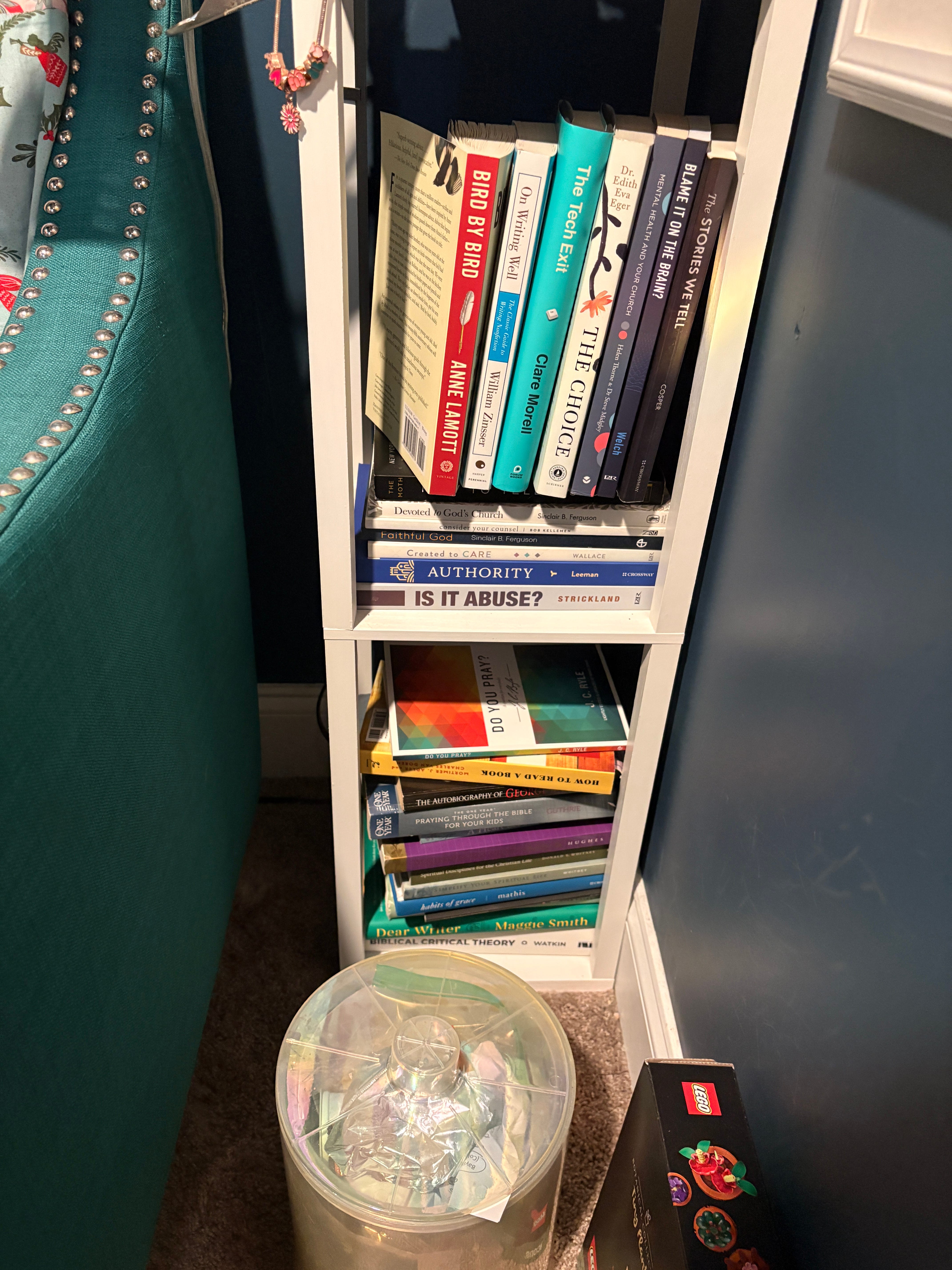 The lower shelves of the floor lamp are 1) books I want to read and 2) books for research and writing purposes. I also have a small trash can (it was supposed to be an ice holder) and the LEGO Botanicals Tiny Plants set that my sister and brother-in-law gave me for Christmas but that I haven’t even opened.