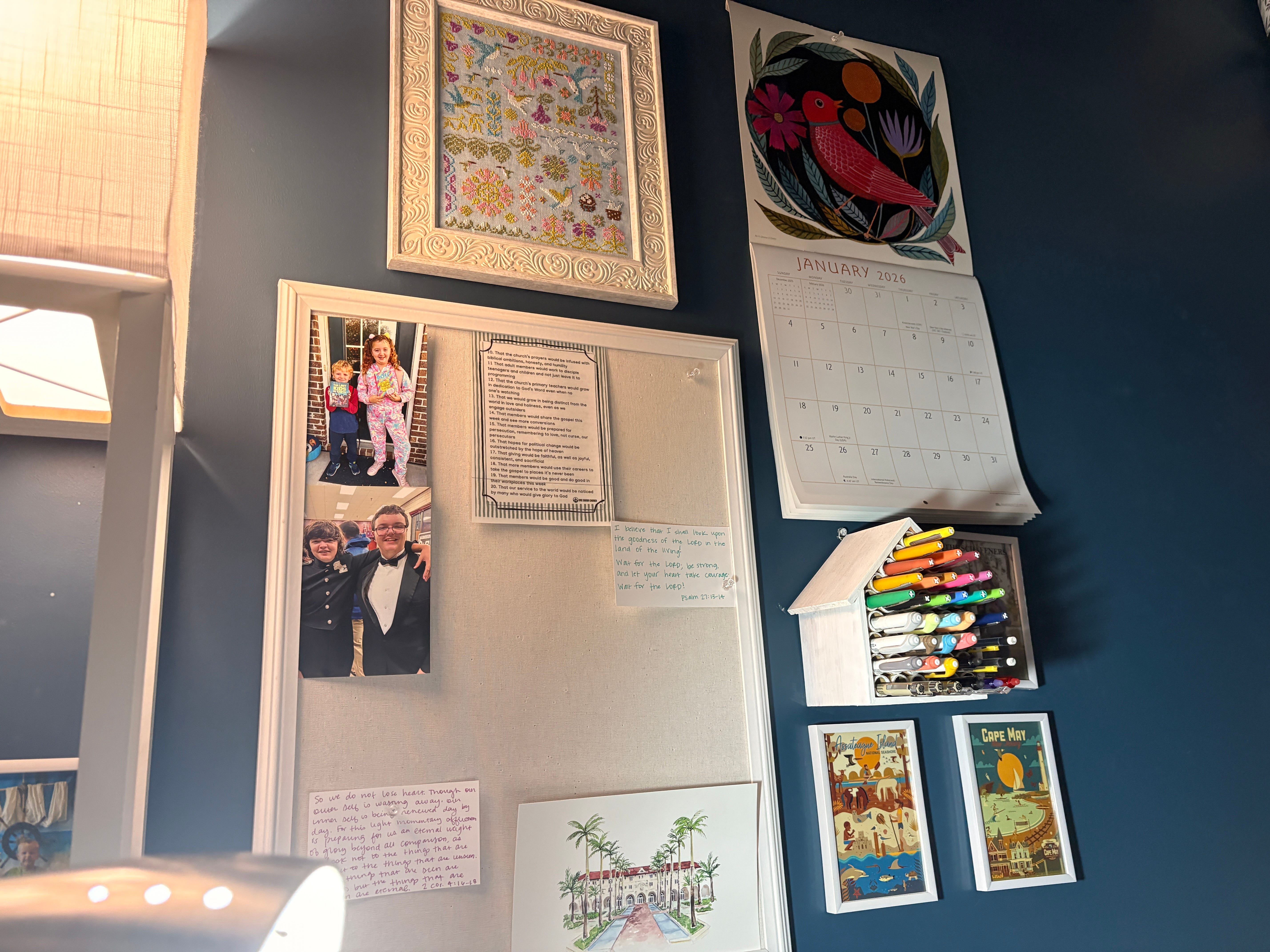 Here is the view to the left of my chair. A bulletin board I got at Target, a framed piece I cross-stitched, a calendar, a repurposed bird house that I turned into a place to keep more writing utensils, and some framed cards to remind me of past trips.