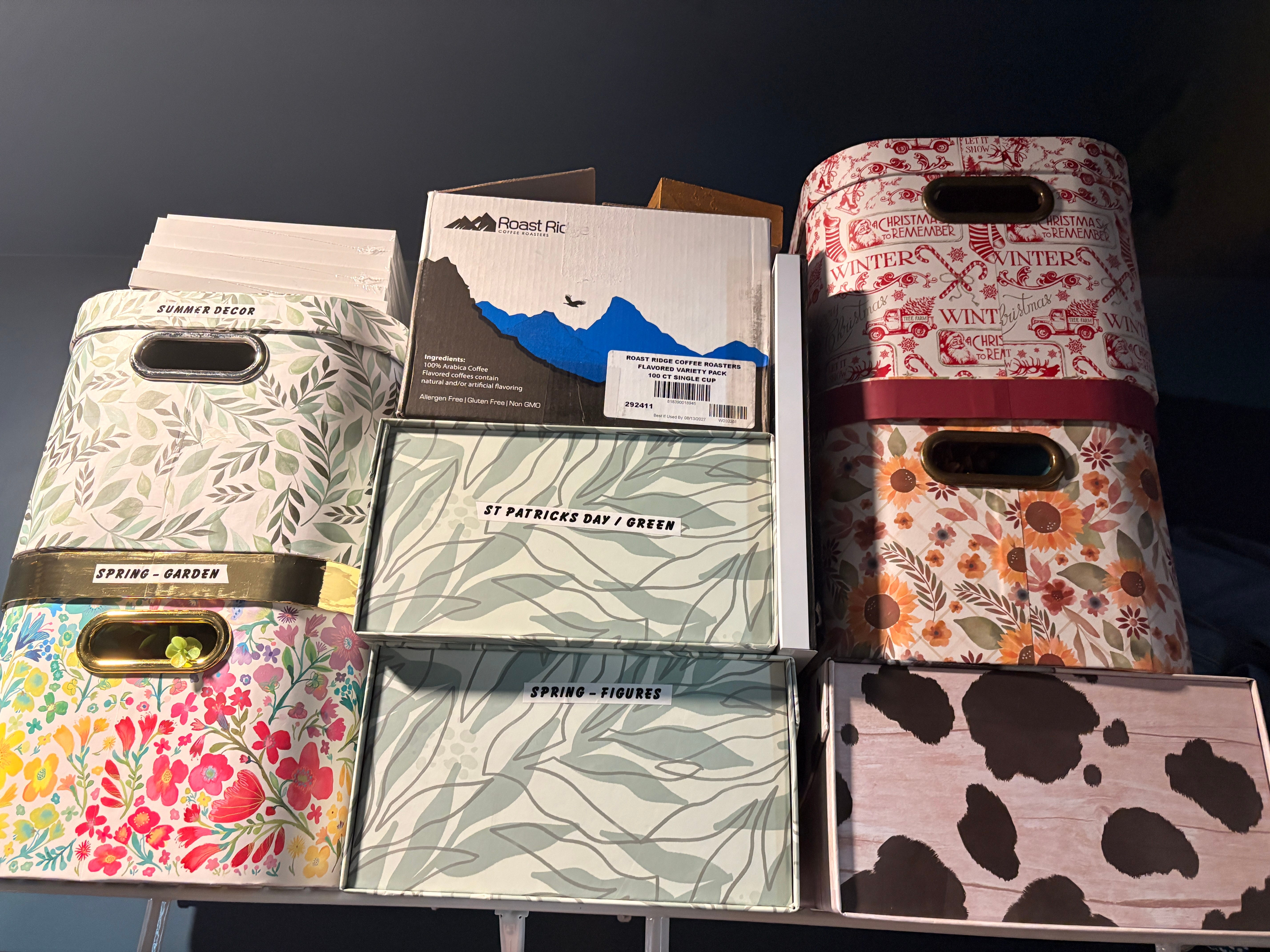 On the shelf above my clothes are a variety of boxes from Hobby Lobby that contain seasonal decorations I put downstairs in a tiered tray. Again, minimalist in some areas, and not so much in others.