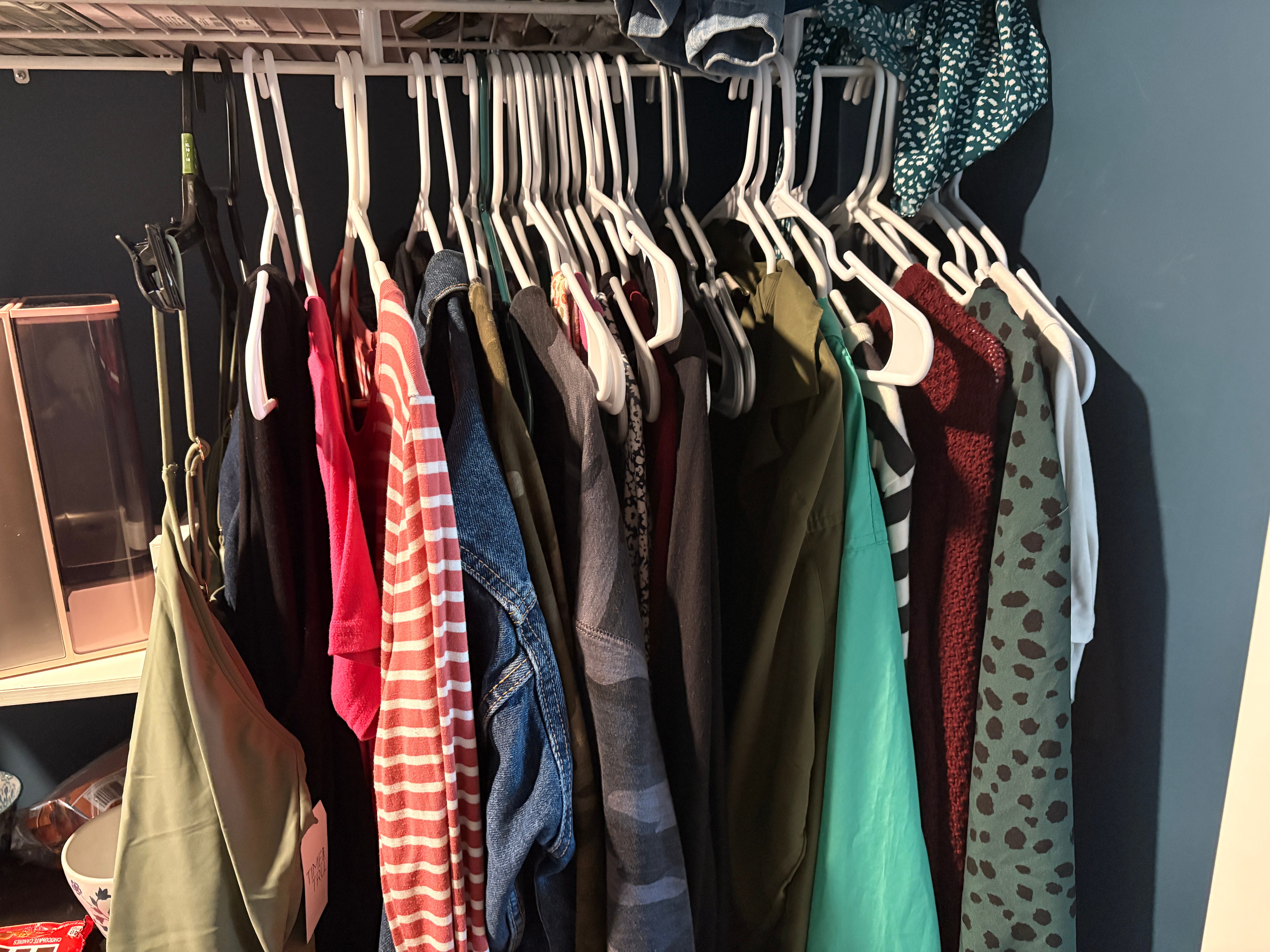 Yes, these are almost all of my hanging clothes—a few summer dresses are in a bin. You may be asking yourself, “Does she have more writing utensils than she has articles of clothing?” and the answer is almost certainly yes, although I’ve never counted. I never claimed to be a minimalist in all areas of life.