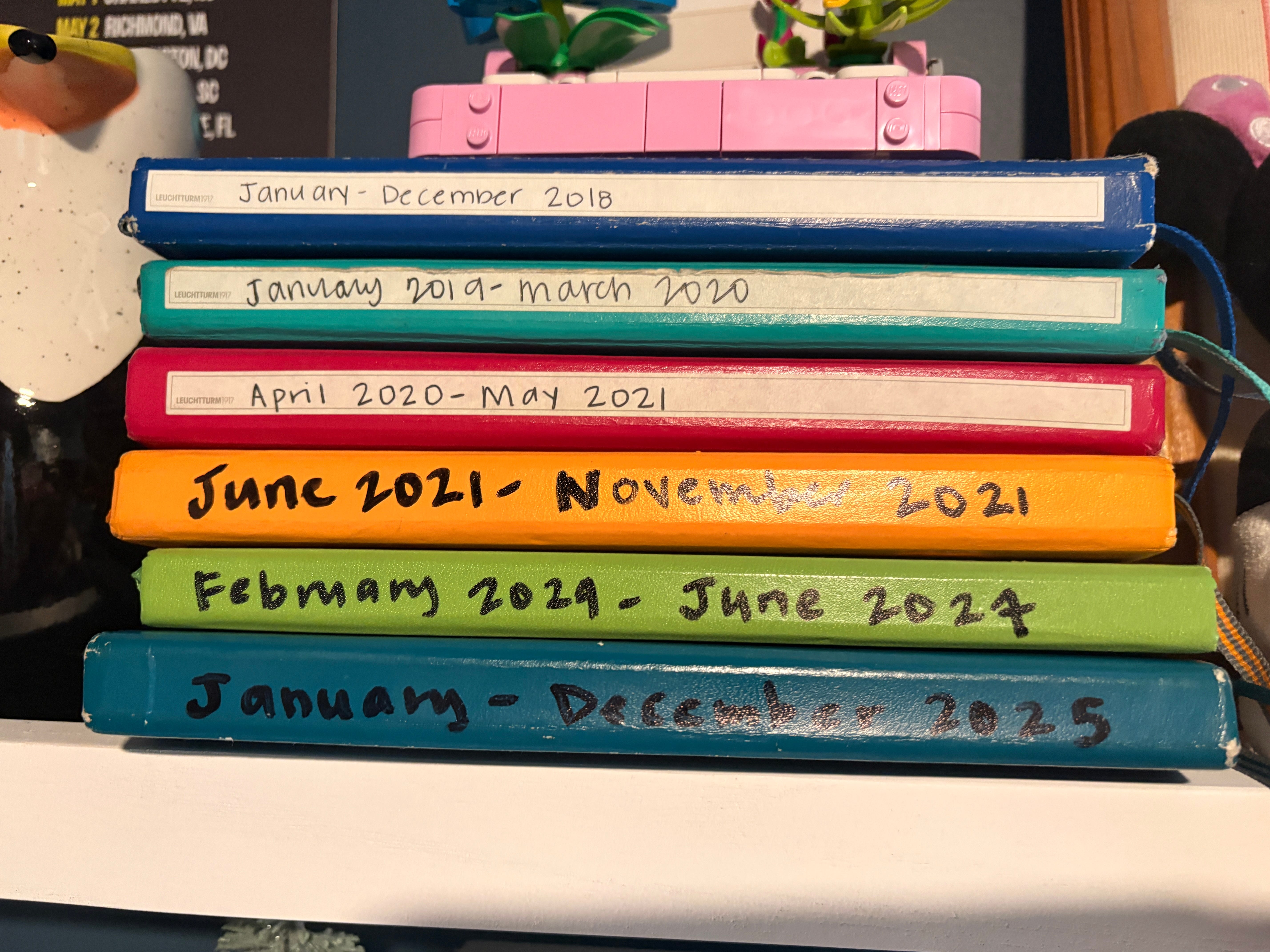 I have all my old bullet journals here, and sometimes I flip through them for fun. All but one of them (the green one) are Leuchtturm 1917 A5 dotted journals, and I still regret buying a cheaper version that one year because it was not the same. I’m back to the Leuchtturms and I don’t plan to change.