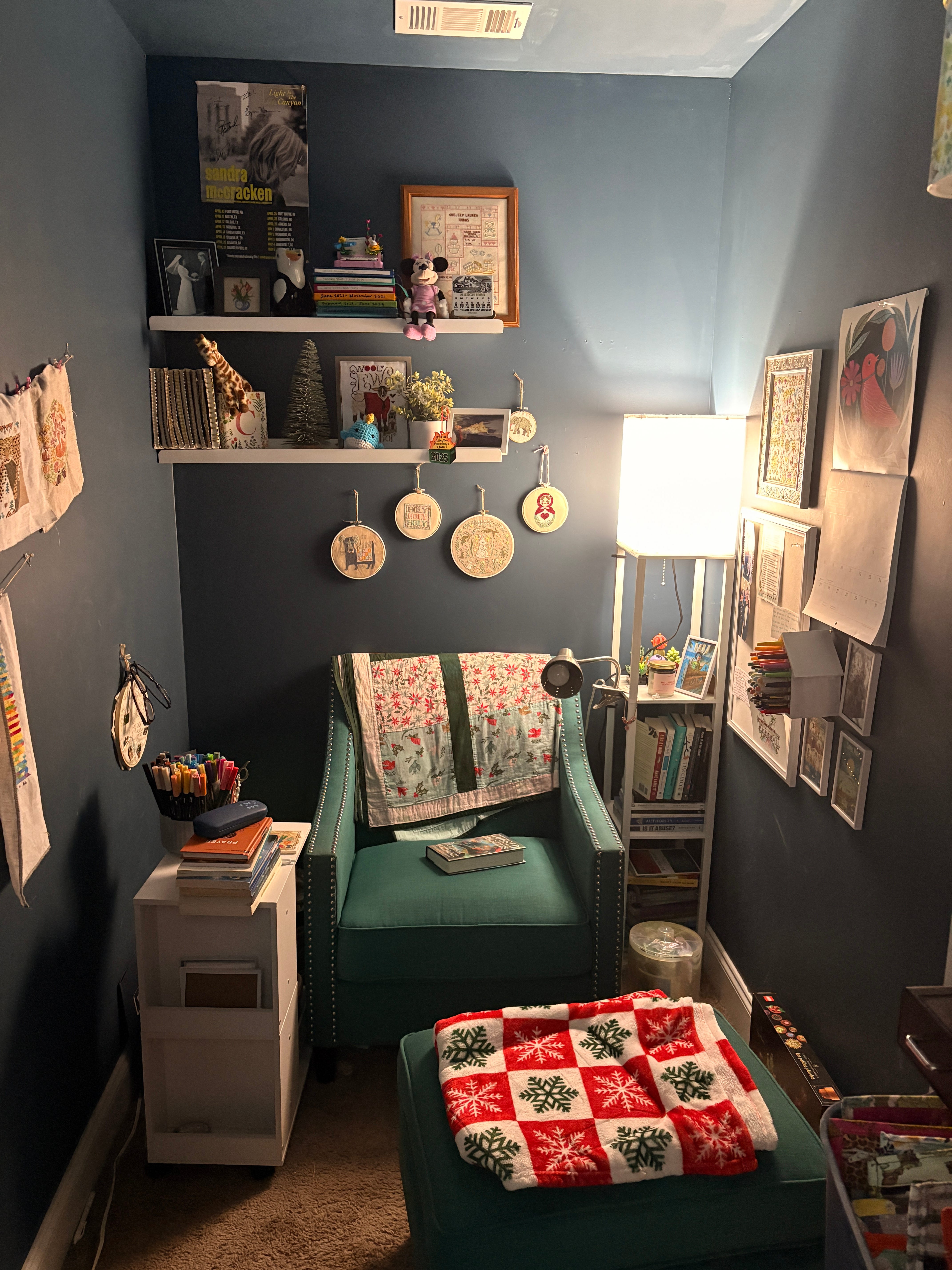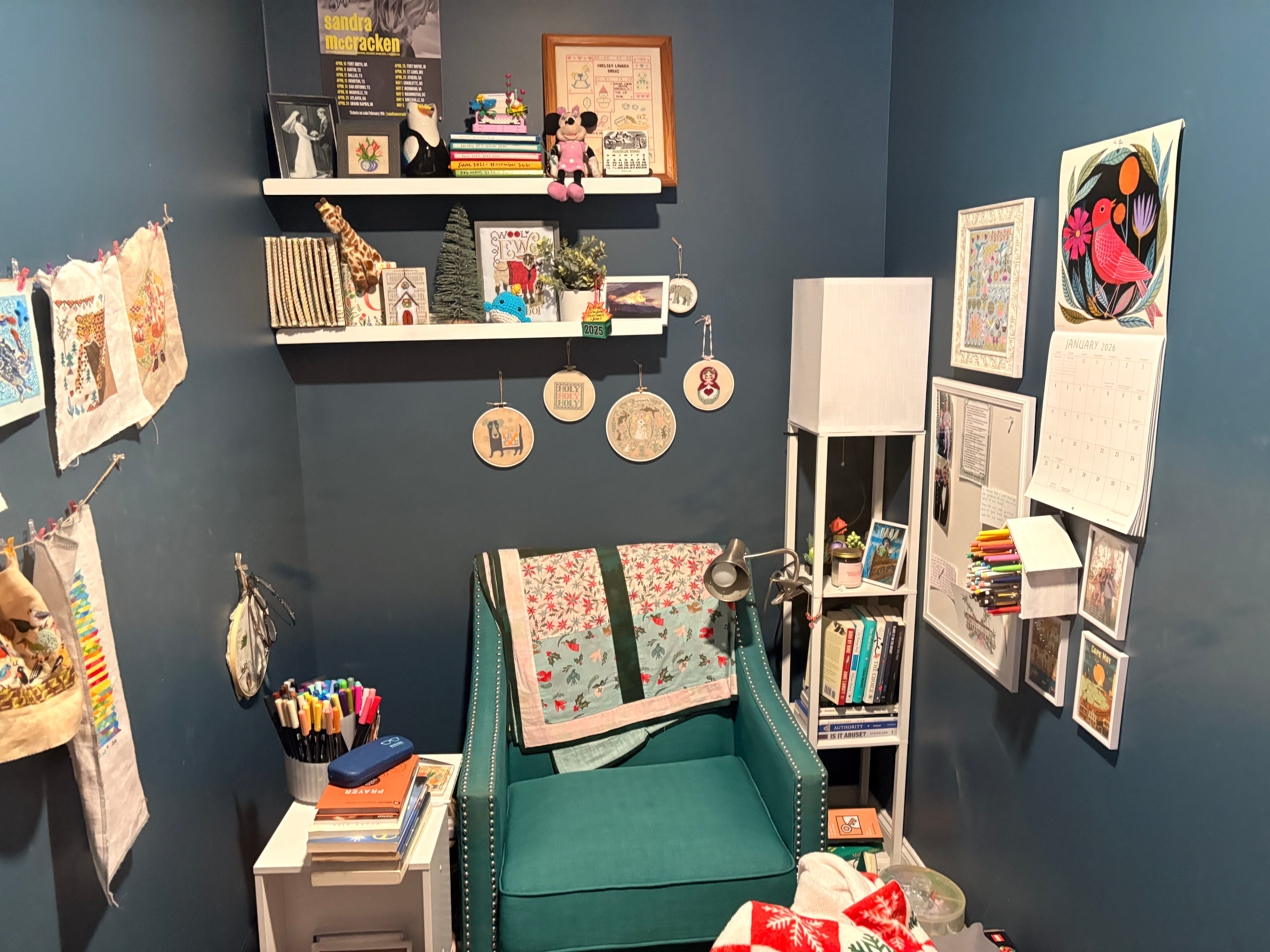 I also bought a gooseneck phone holder and repurposed a basket to keep my journals and books in. I clipped an additional lamp to the floor lamp for better lighting when I’m stitching. And I hung some fairy lights on the shelves.
