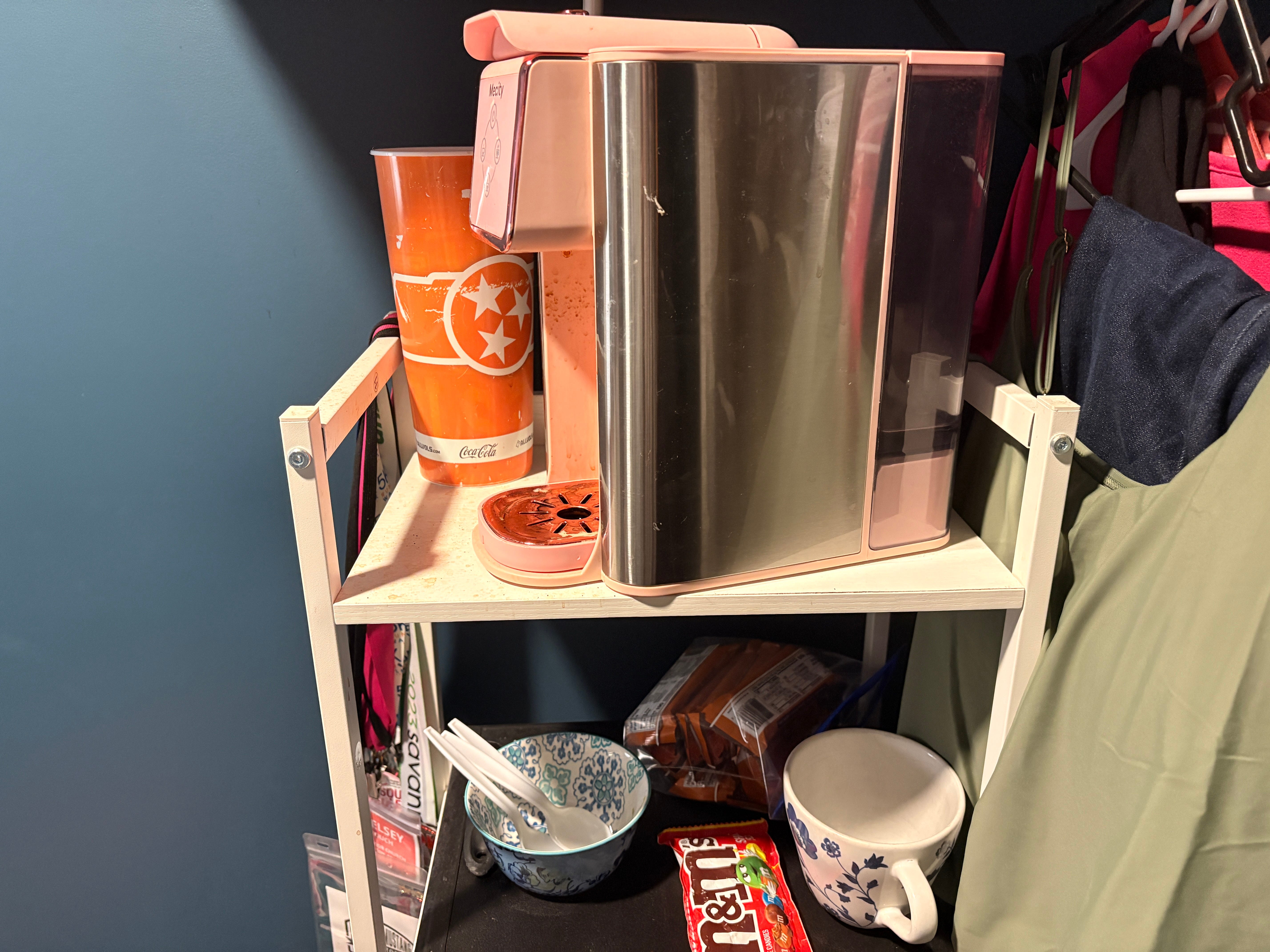 Finally, we have the coffee and snack station. I usually have a few more coffee cups up here, but not today. I use the orange cup to refill the coffee maker. That bag in the back is protein bars. Sometimes I have overnight oats in the fridge, and the plastic spoons are to eat that with. The peanut butter M&Ms are just because.