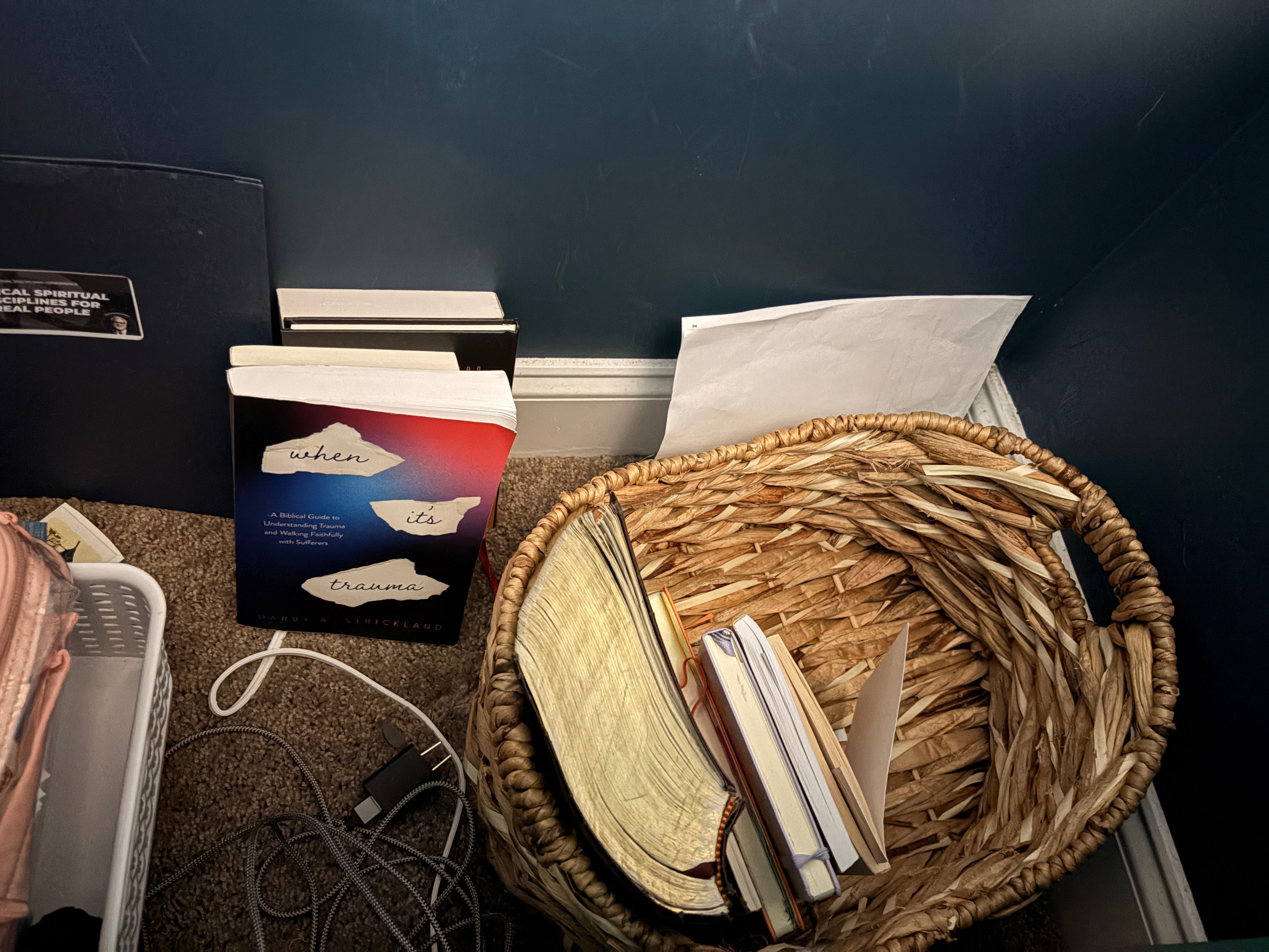 On the right side of my chair, in the opposite corner from the floor lamp, is that same basket you saw in the original Dopamine Den photo. Here I keep the books I’m currently reading, my journal, my bullet journal, and anything else I want to find quickly. Up against the wall are books that I’ve already read but that I haven’t been able to pull my favorite quotes from yet. I also have a phone charger that plugs into a long extension cord because sadly, there are no outlets in the Dopamine Den.