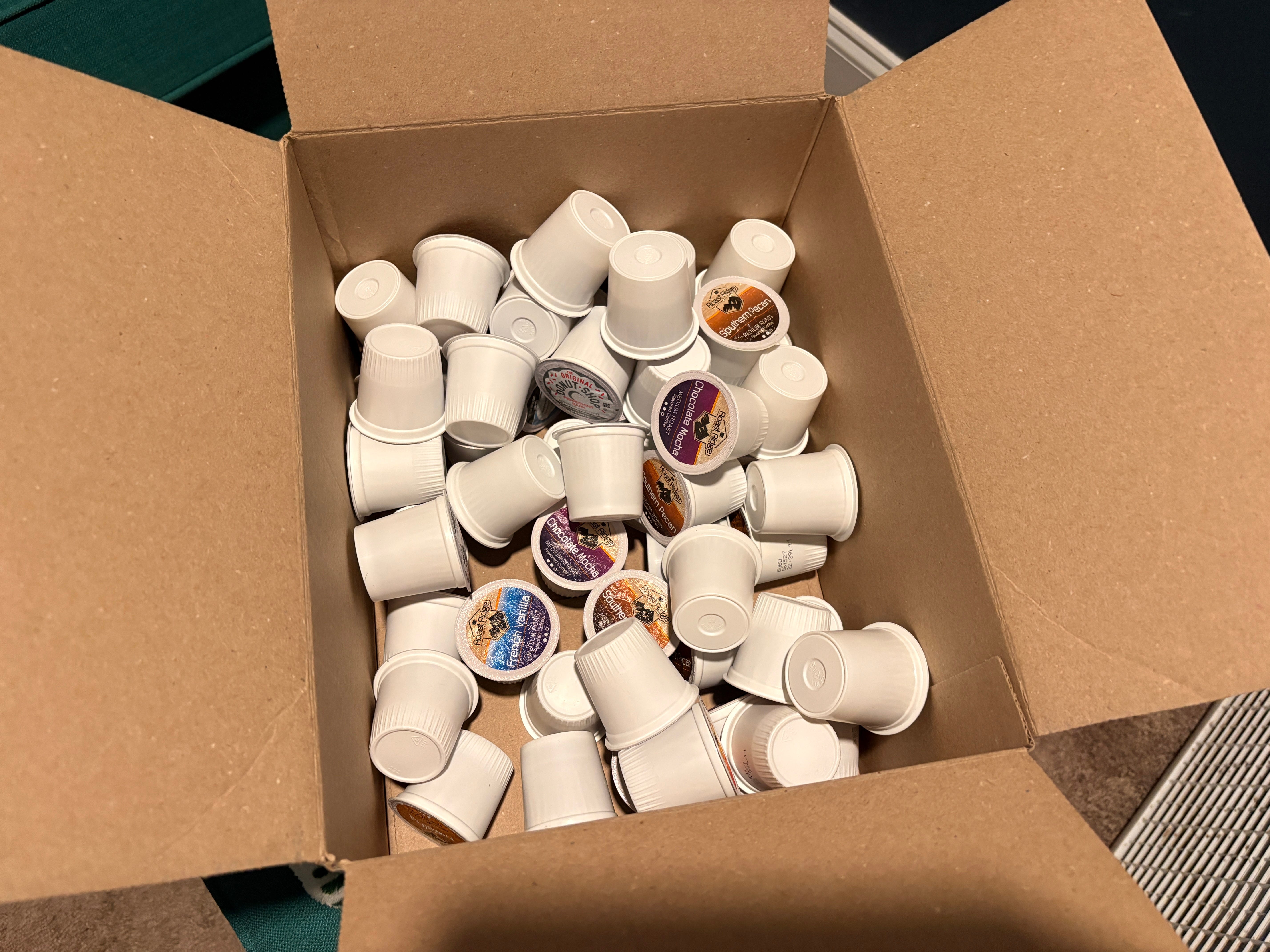 I keep the box of extra K-cups on the top shelf and refill as needed (according to my fancy). I only buy K-cups when they are on deep discount and then I dump them in this large box, where they wait to be chosen for an honored place in the black drawers.