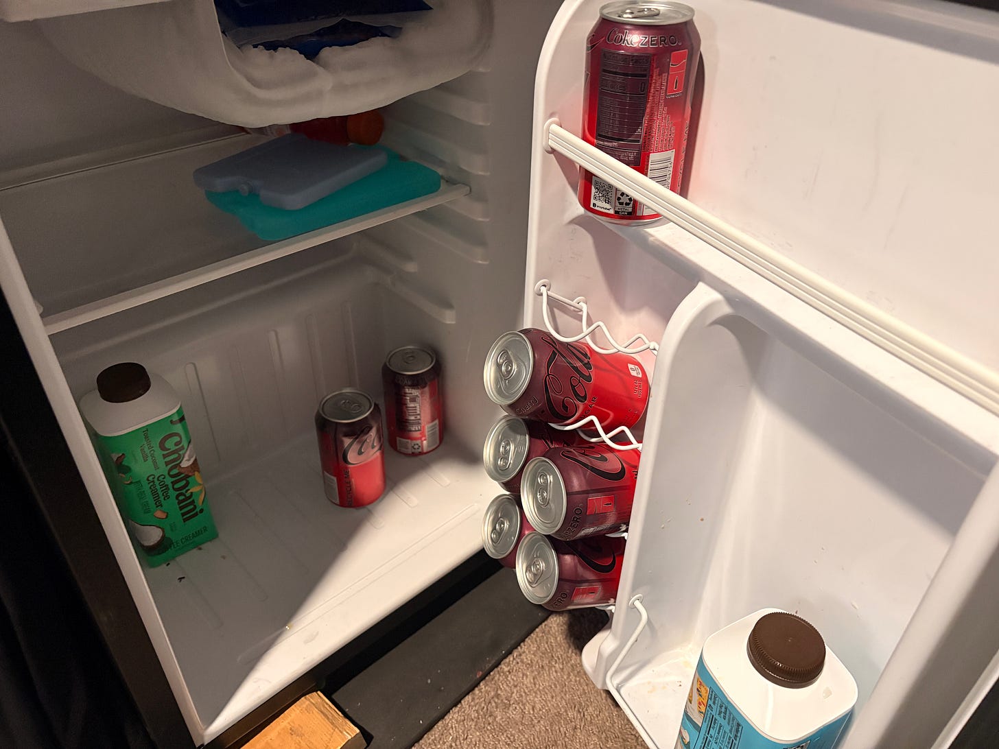 The fridge is looking a little sparse, but it is stocked with the basics: Chobani coffee creamer and Cherry Coke Zero.