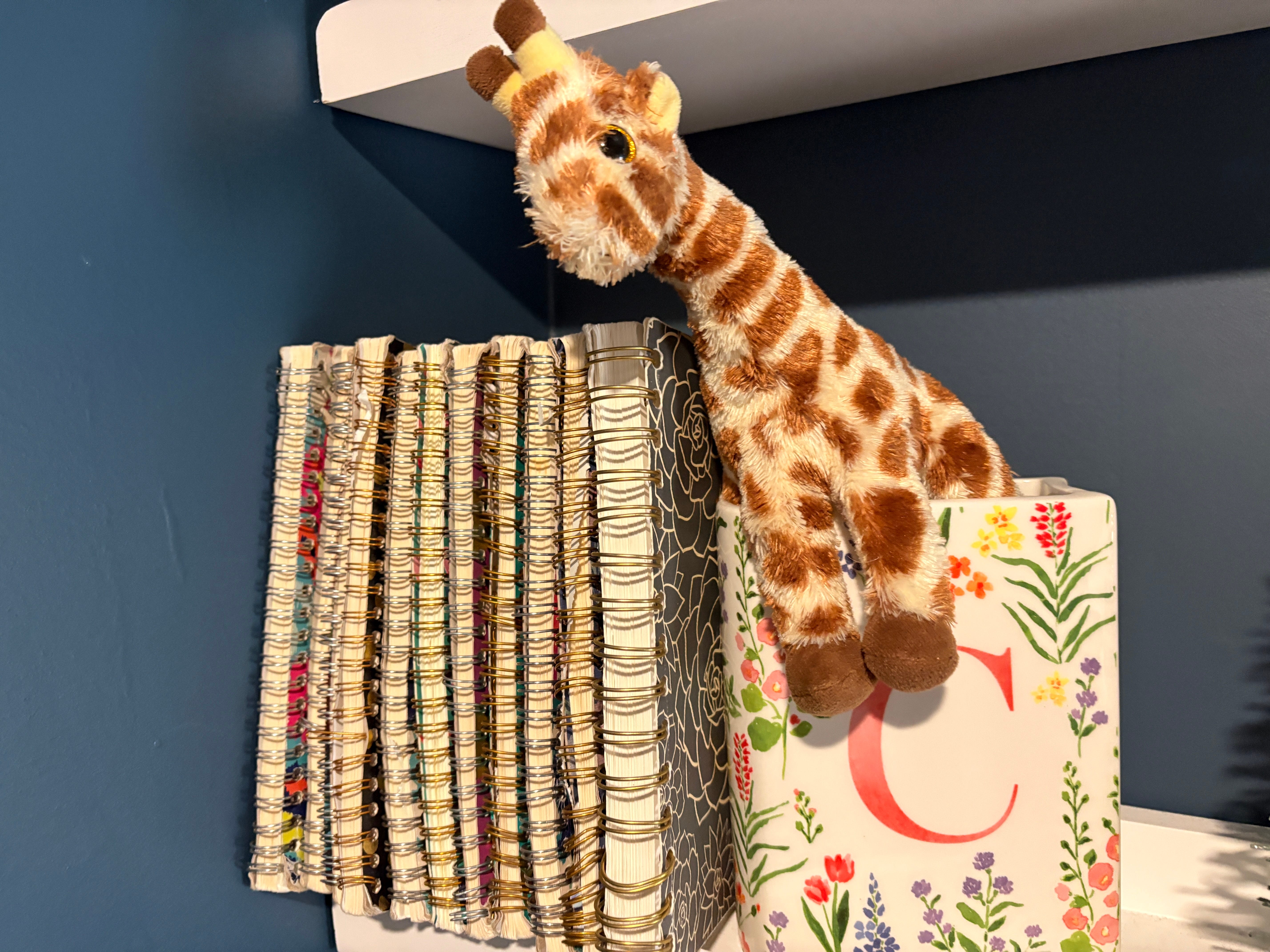 This is the other collection of my journals, but these are my actual journals I write about things in. These date back to the summer of 2015, and I am so grateful for the seasons when I wrote frequently. It is always encouraging to look back and see the Lord’s care over many hard years. The giraffe was Noah’s; he used to sleep with it but then decided he didn’t want it, but I couldn’t bear to part with it. I like to think it’s the remaining connection between the Dopamine Den and its former purpose.