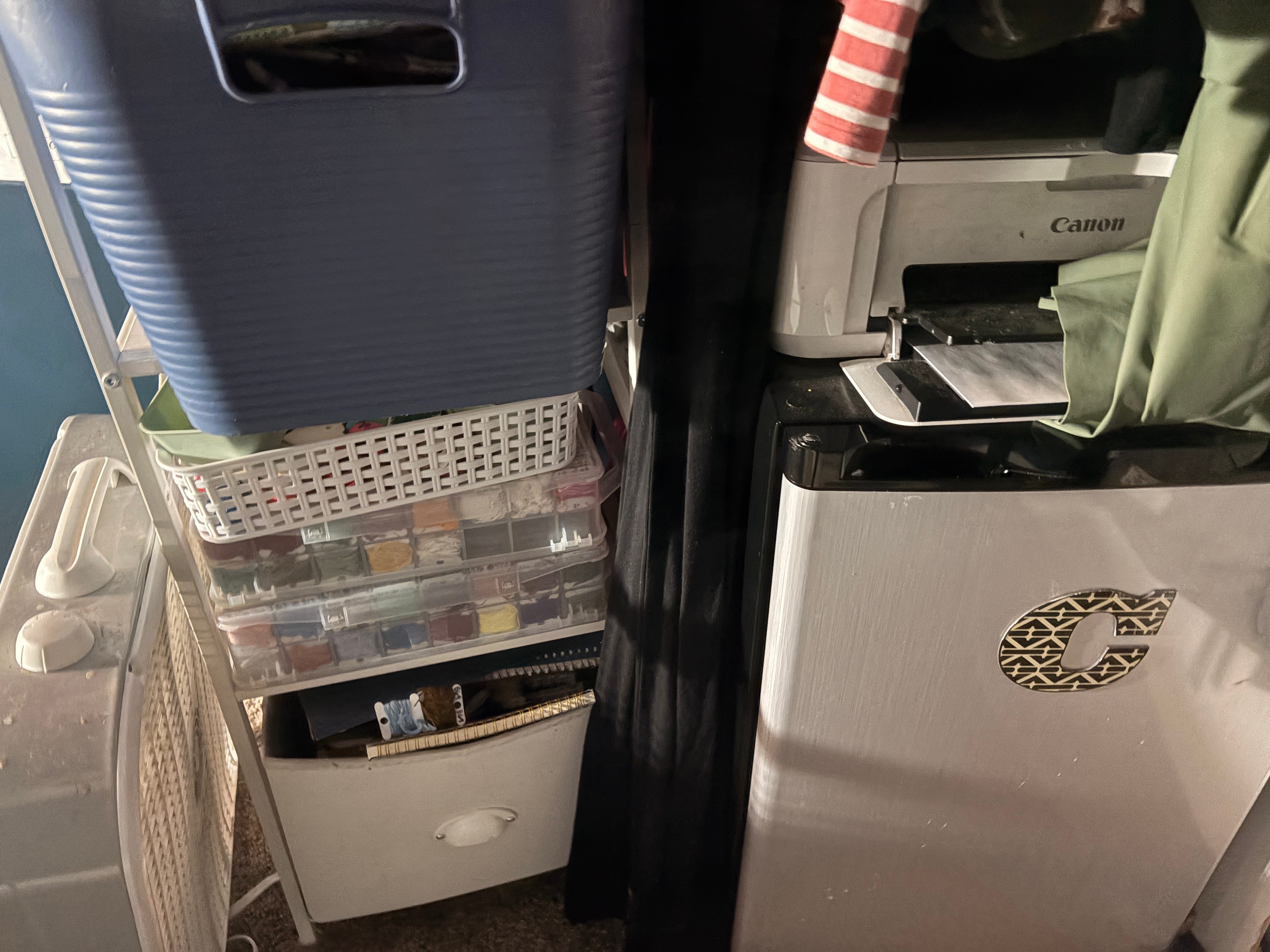 To the right is my mini-fridge and our printer on top of it (my clothes are above these). On the left is another shelf where I keep my cross-stitch supplies and other assorted things (such as extra journals).