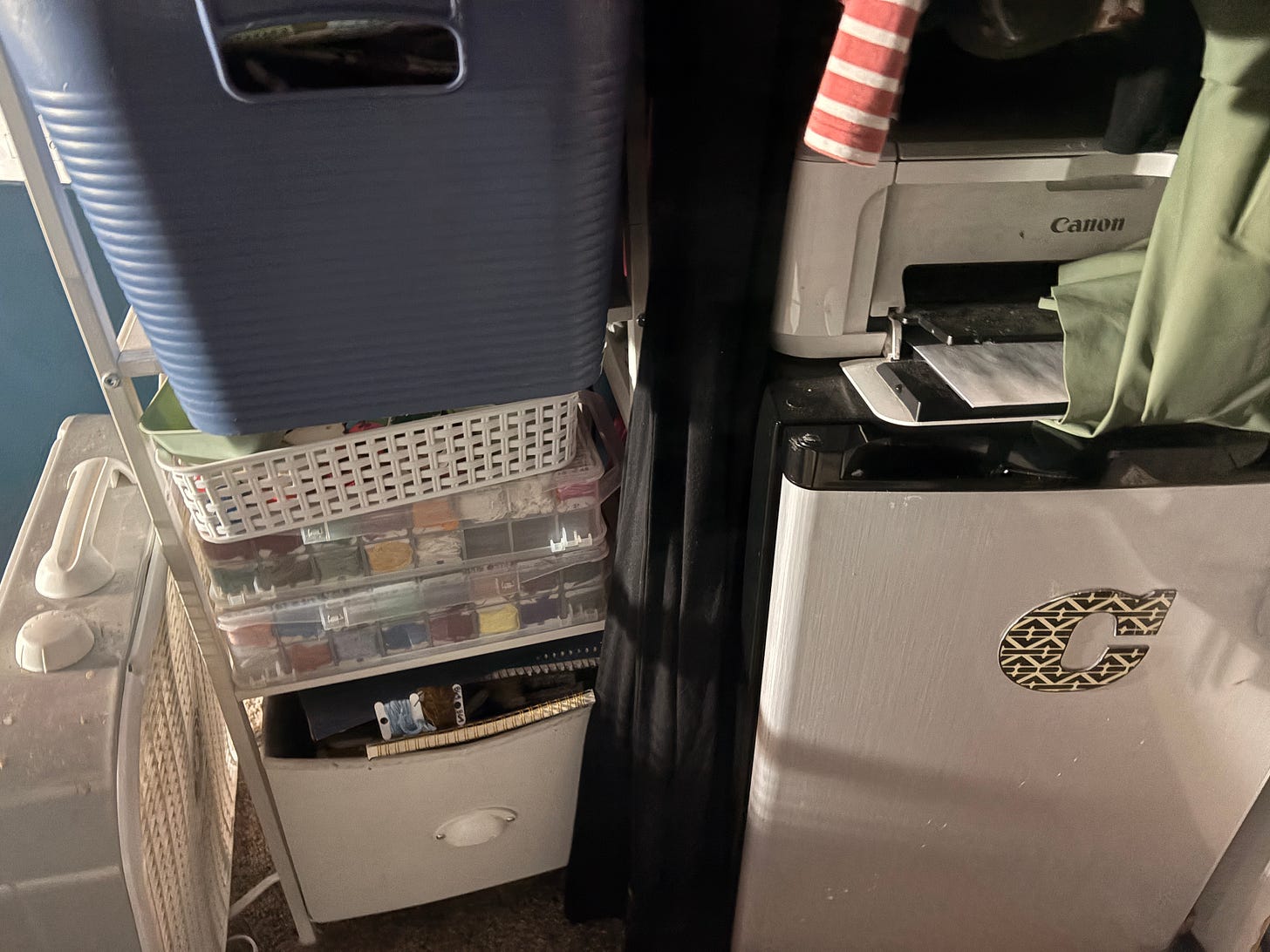 When I go on trips, even just for a few days, and then I come home, I always walk into the Dopamine Den and breathe a big sigh. It is part of home to me now, and it is the one place in the house where it’s just my stuff, and it only gets messy if I make it messy, and while my kids are always welcome to come find me when I’m sitting in my chair, they know that they may not remove things without asking, so things are always where I left them.