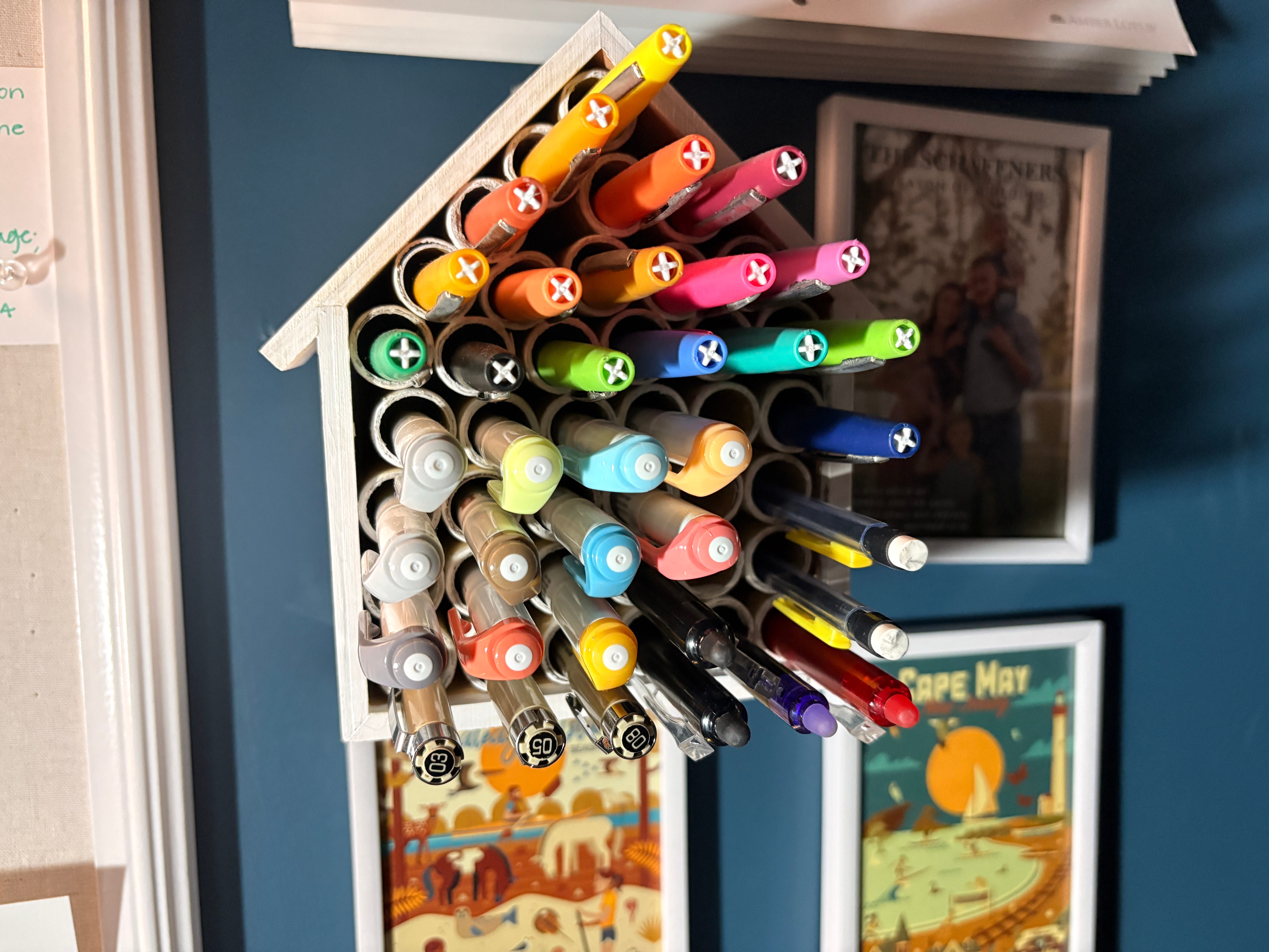This is the overflow of my collection of writing utensils, because I have too many to fit in the other receptacle in the Dopamine Den. As you can tell, this one is also close to being full. I got this birdfeeder in the dollar section at Target. I was there with a friend, and she said, “You could stick pens in there.” I bought it, painted it white, and hung it here to indeed put pens in it. (The writing utensils in here are a mix of Paper Mate Flair felt tip pens, Sakura Pigma Micron pens, Pilot Frixion erasable gel pens, Zebra Pen Dual-Tip highlighter markers, and BIC 0.7 mm mechanical pencils.) The ones in here are either duplicates of colors I already have in my other container, or they are colors I don’t use as often. I am not often compelled to highlight things in brown if I can avoid it.
