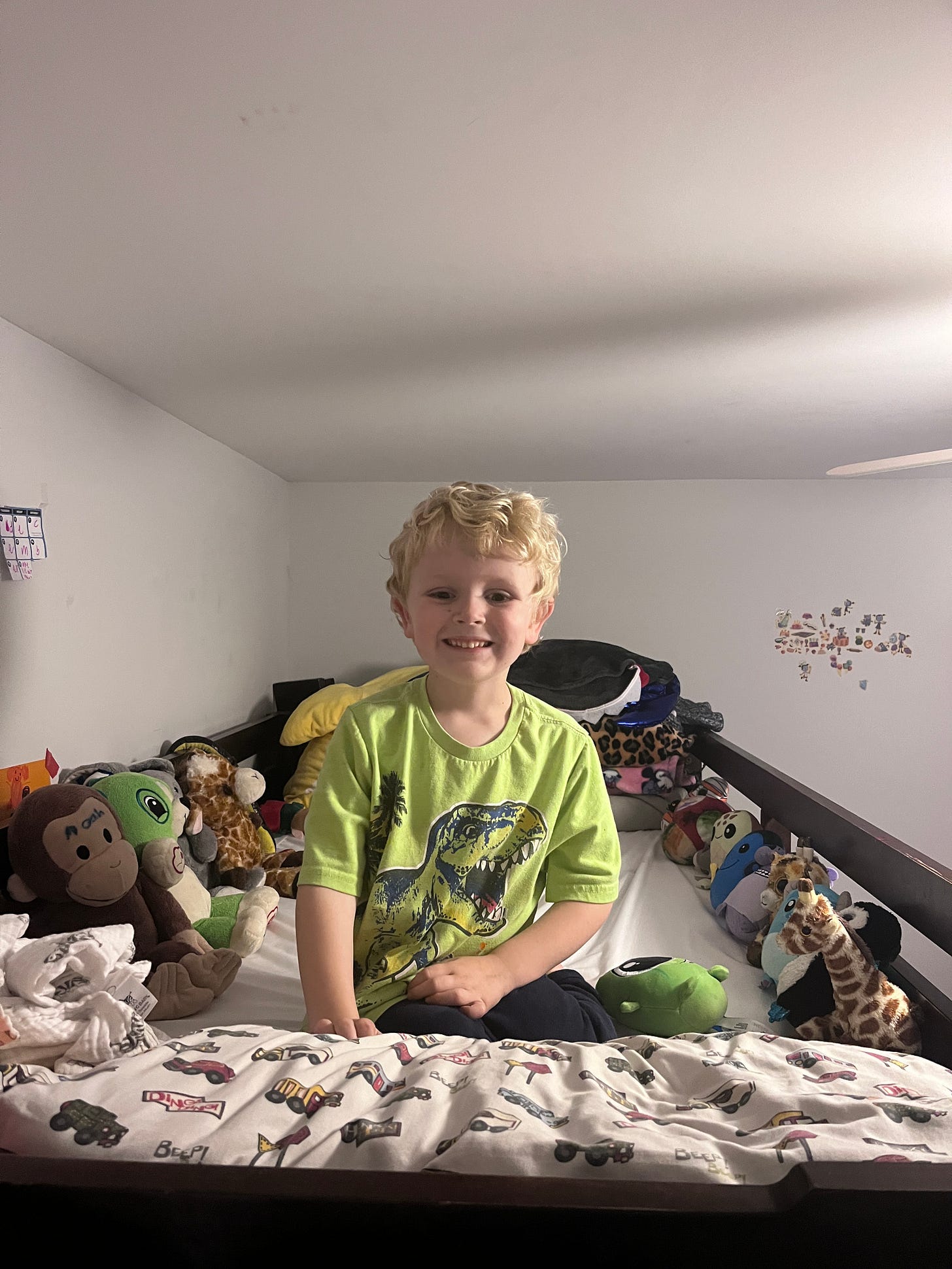 By the time I got home from my trip, he had decided he was ready to share a room with his sister and she had helped him get his bed all set up (please note the arrangement of stuffies around the perimeter).
