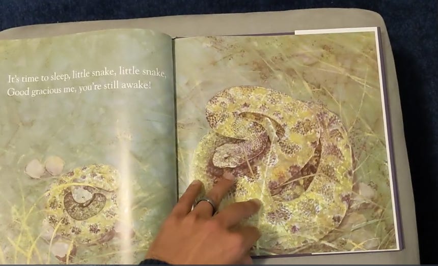 Why, among adorable pictures of bumblebees and rabbits and cows, would you include this? I could not read this to my sister when I was younger. It was too much for me. And, of course, if I tried to skip it, she wouldn’t let me, because she loved snakes.