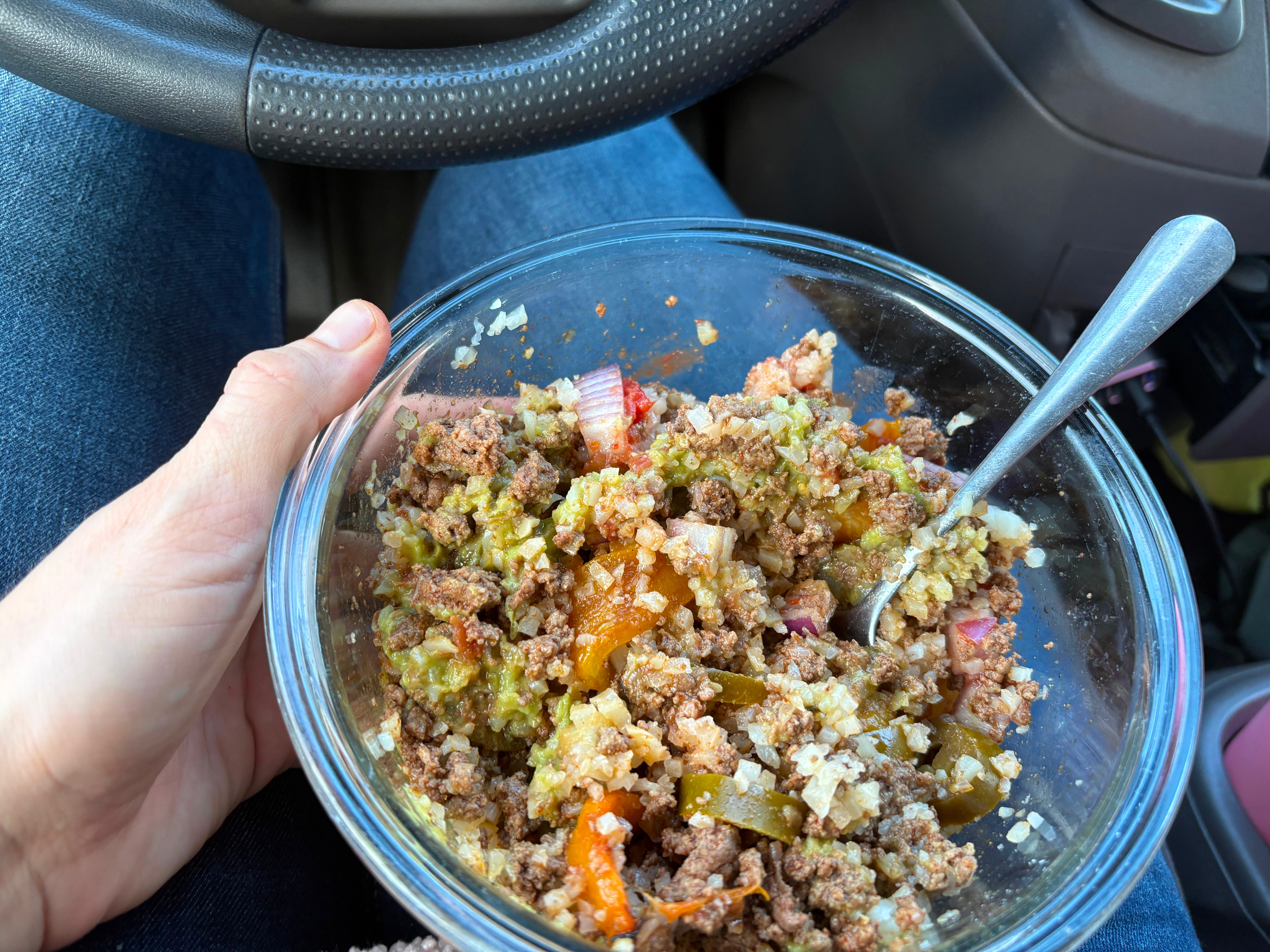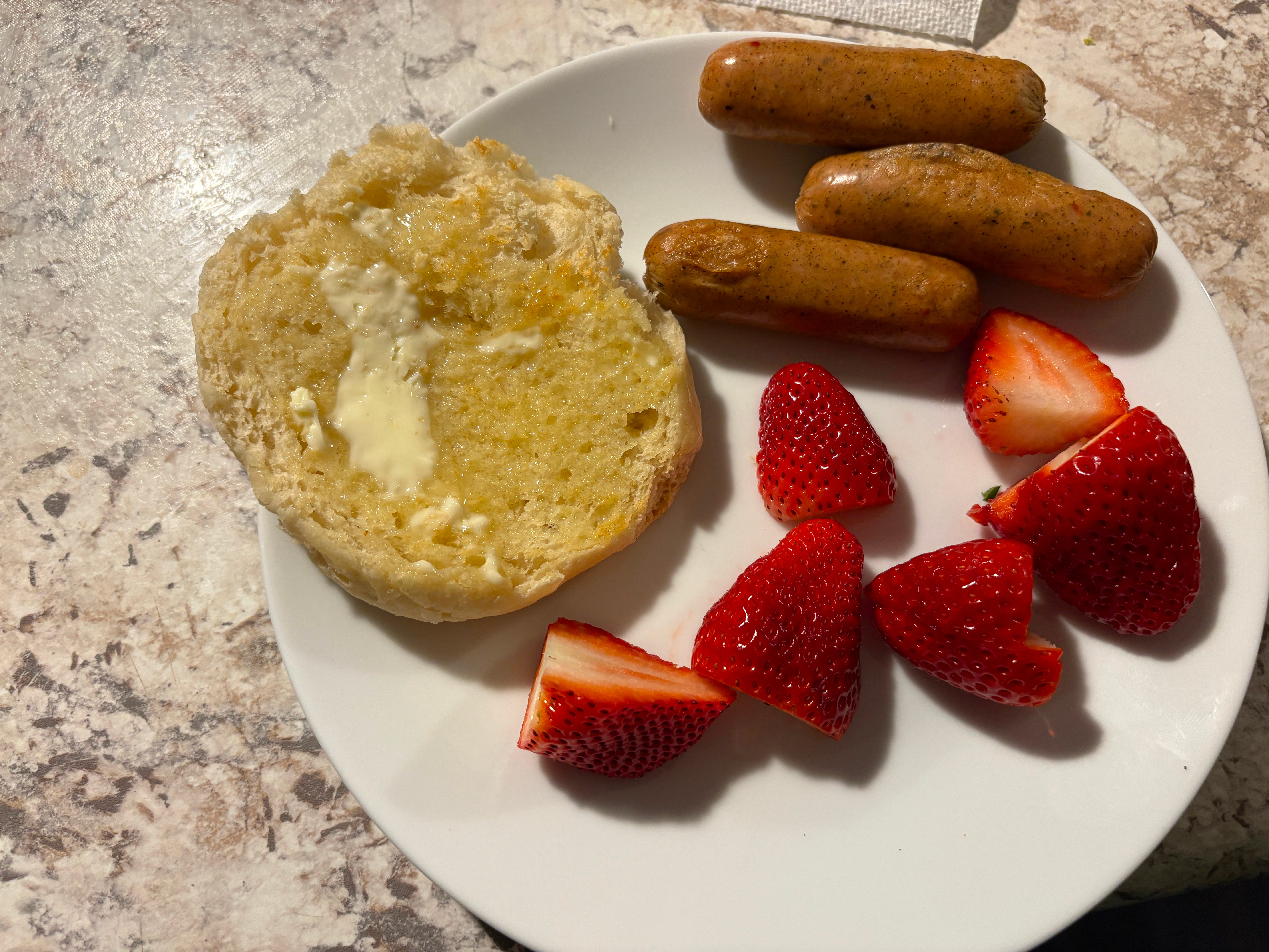 For lunch, each kid has their own routine. Our oldest gets school lunch every day. Our second son packs the same lunch every day (chicken/rice/cheese burrito, fruit, and bag of something crunchy). The younger two mix and match based on what’s on the school lunch menu. If they want to pack a lunch, they usually take some kind of sandwich (ham, peanut butter & banana), fruit, something crunchy, and a water-based juice box. Christian and I eat leftovers, or I’ll cook some kind of protein in bulk and we eat that with vegetables. On Sundays, we make frozen pizza for the kids for lunch.