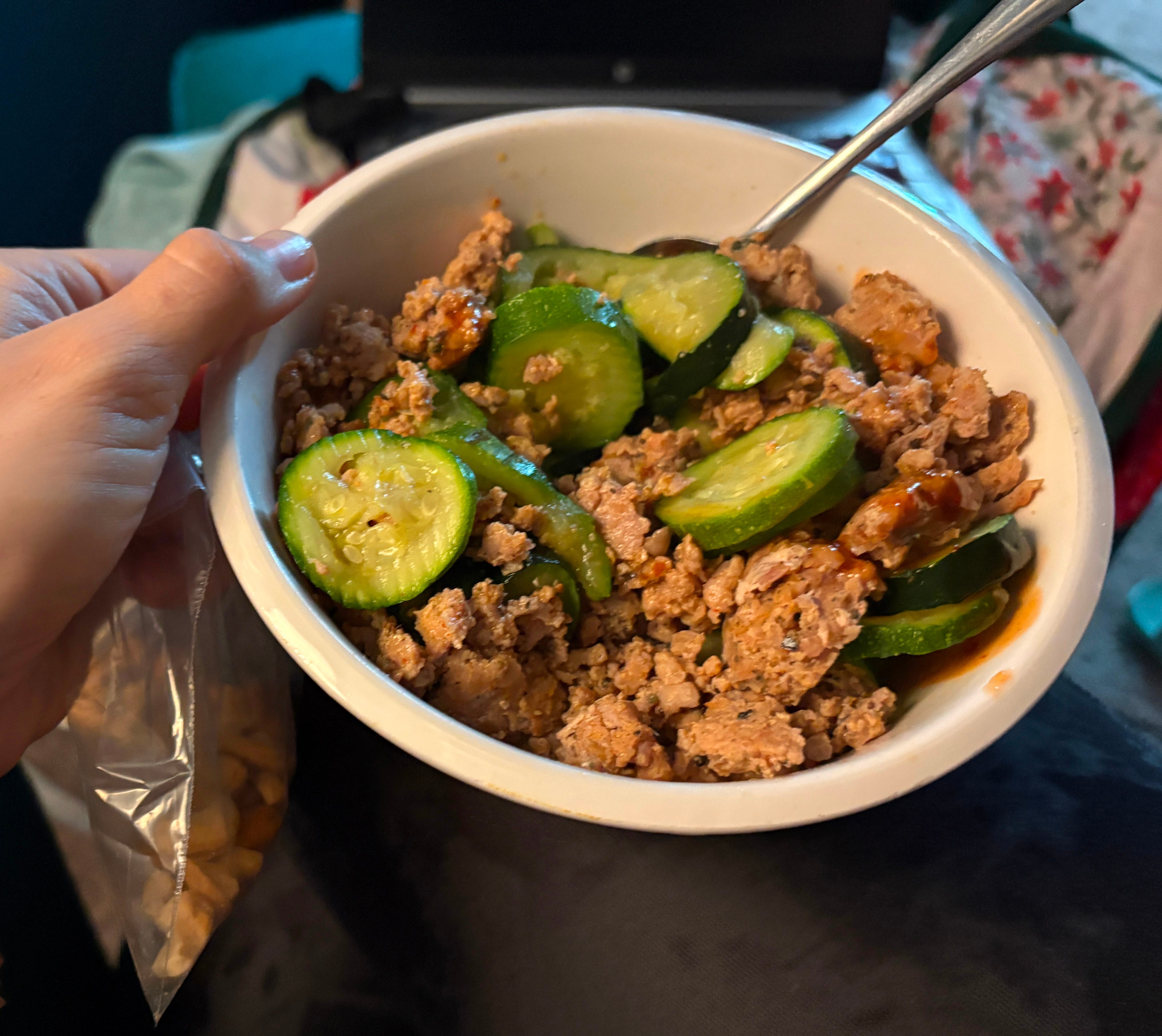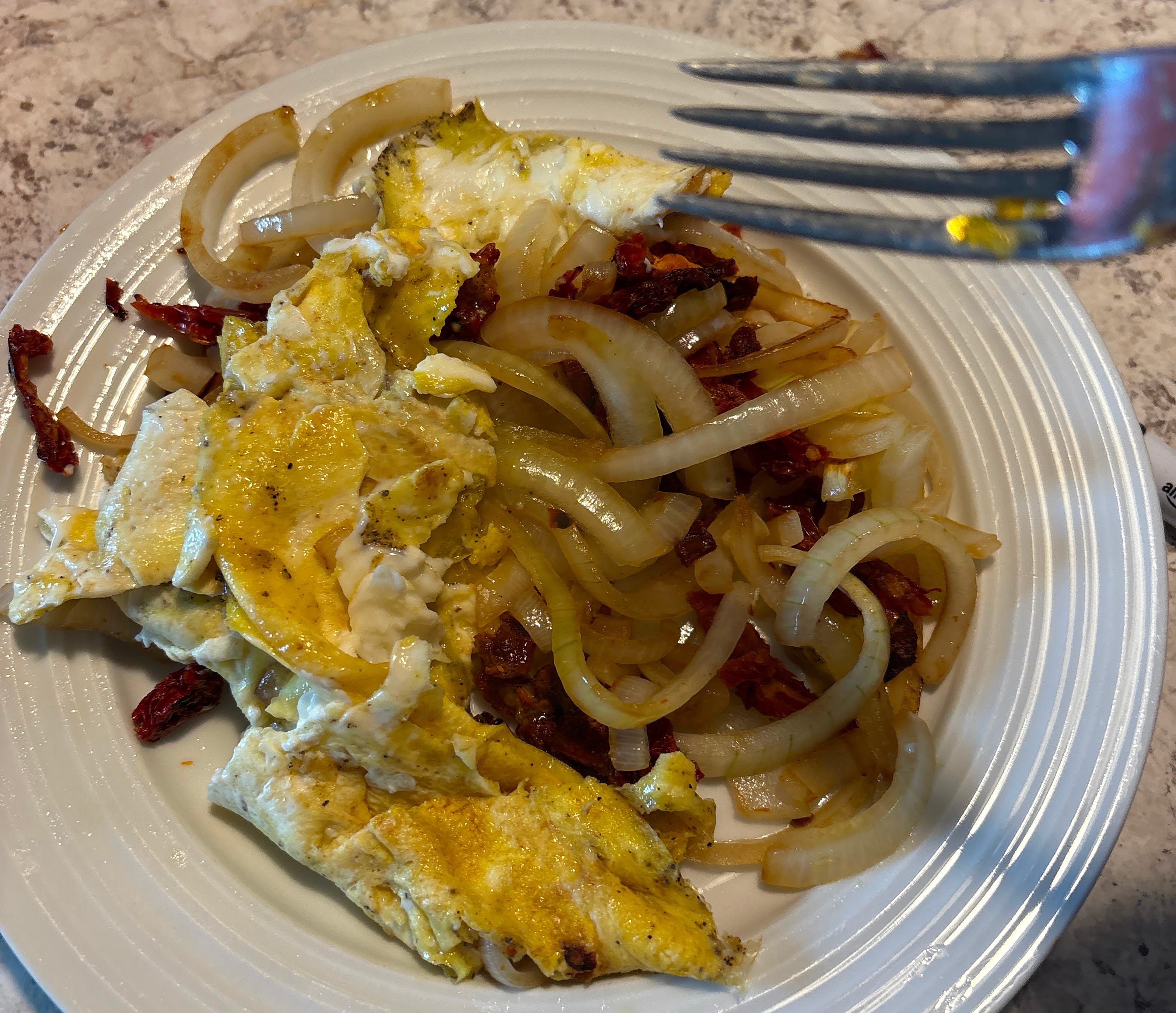 I tried to be creative this week when I could. I wanted eggs but wanted to add something for flavor, so I sliced an onion and added some sun dried tomatoes from a salad I had made for Easter. It was delicious! An experiment turned into finding a delicious breakfast option that I’ll be having again soon.