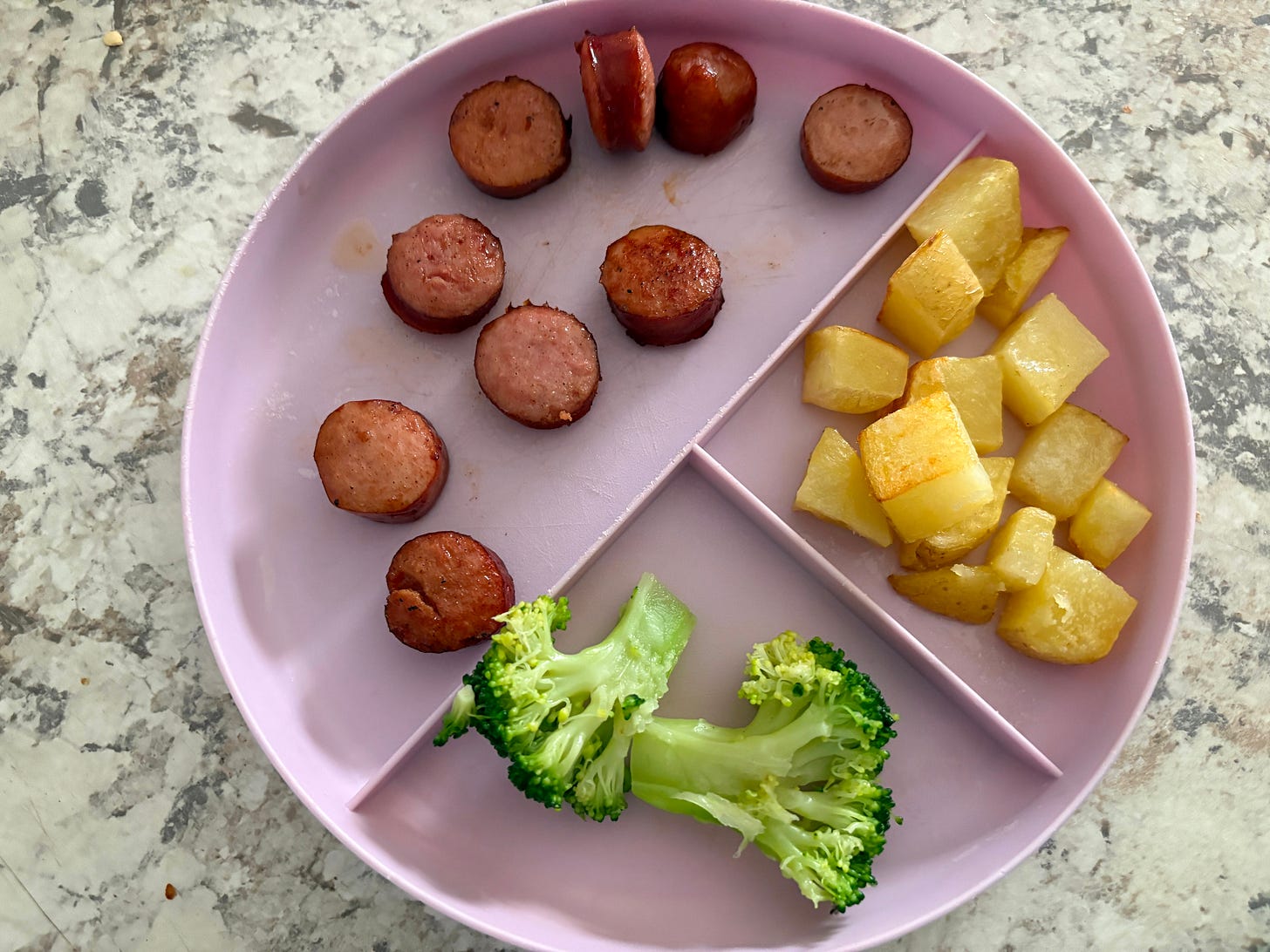 Here was dinner for our 5-year-old one night: smoked turkey sausage, roasted potatoes, and broccoli. Dinner doesn’t have to be complicated!