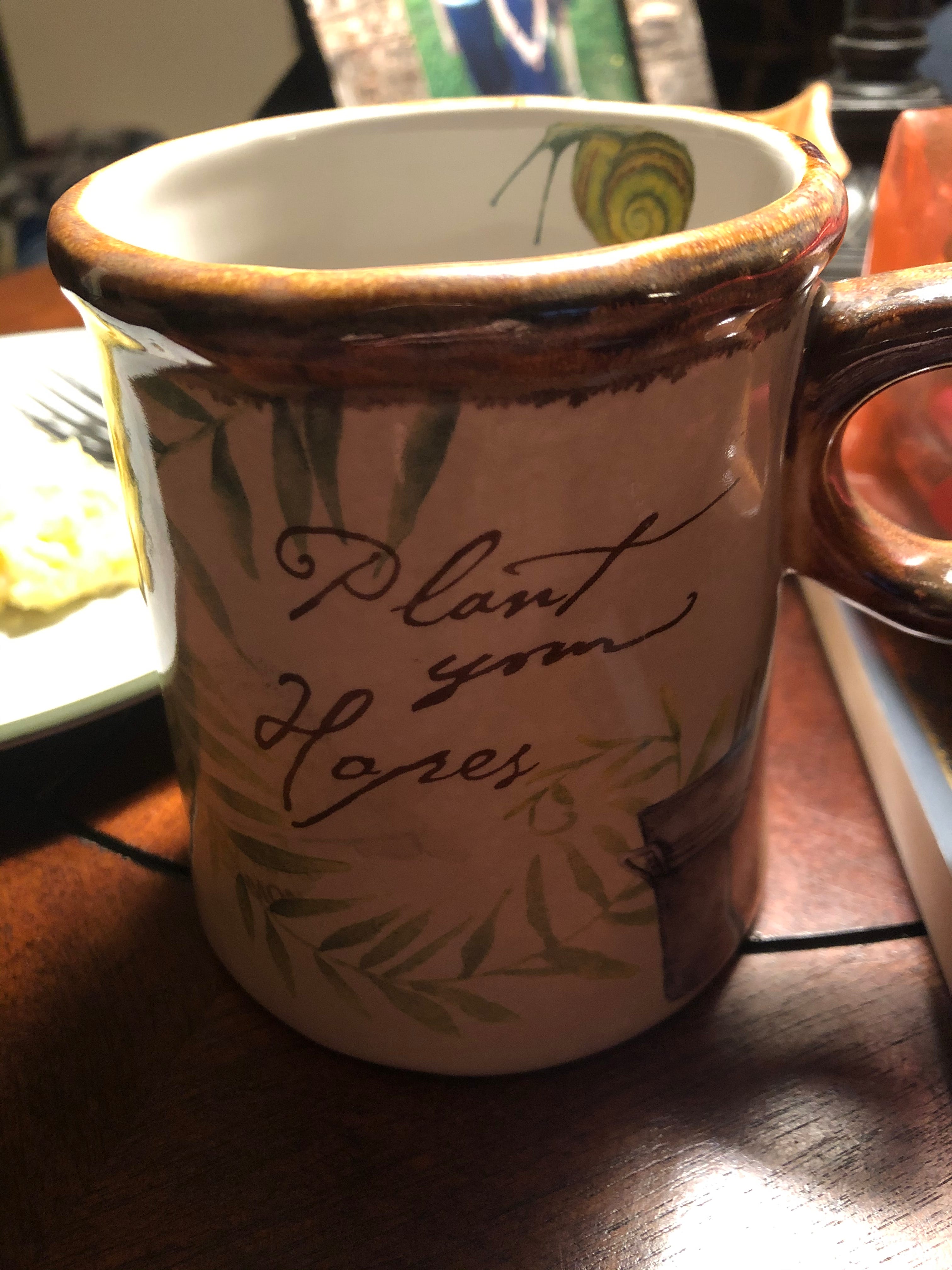 Last week, I was in the kitchen, heating up the cast iron skillet to pan-sear pork chops. The oven was preheating to roast vegetables. My phone rang. It was my friend, Anna. I met her and her family on that very first trip to Georgia in December 2019. In fact, we stayed at her family’s home. Her dad, Billy, was the one who served me coffee in the “Plant Your Hopes” mug in December 2019.